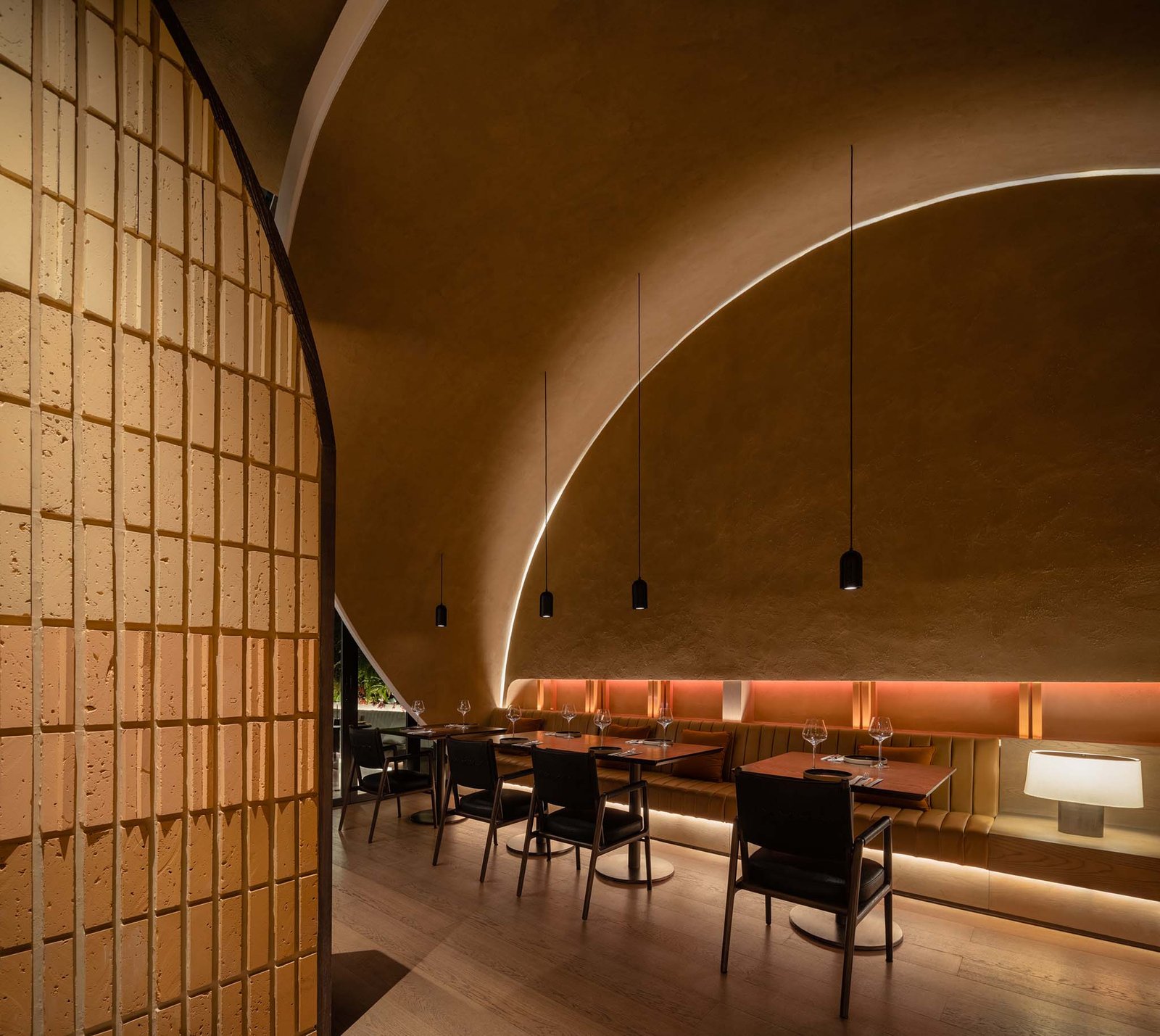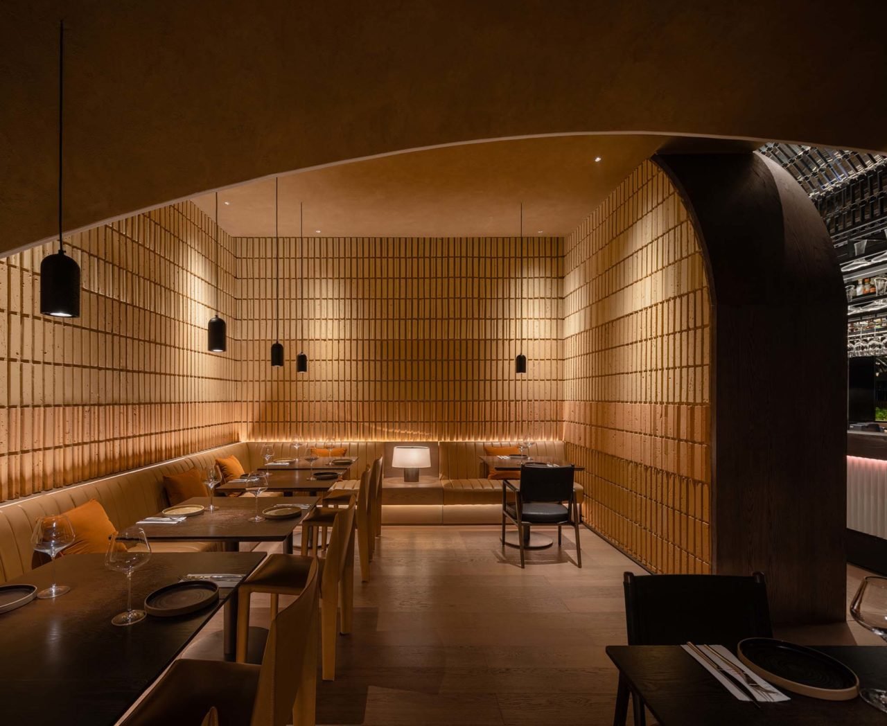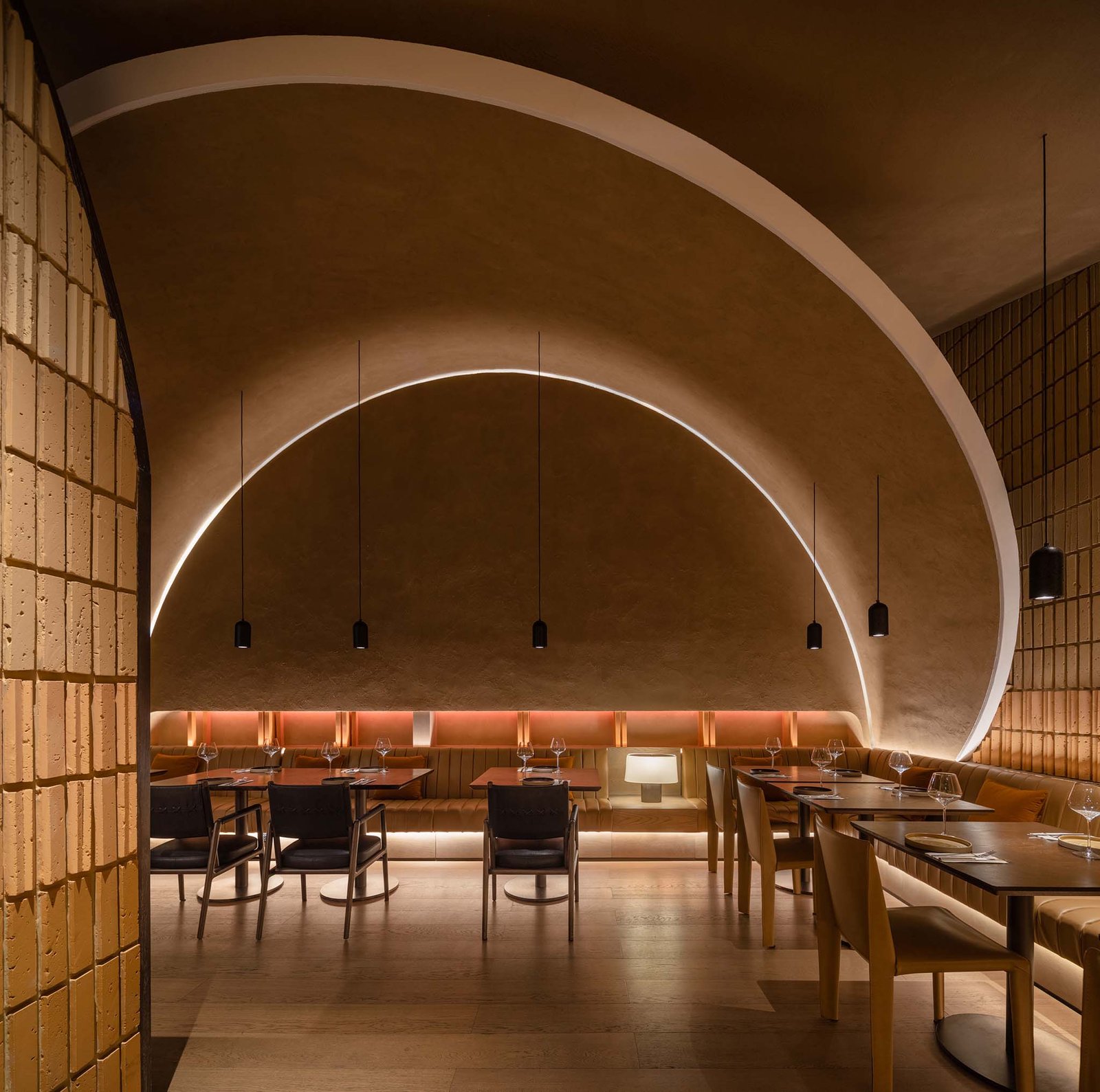 The third wave is located above the dining area. The time stops below this wave, as this wave gets a flat surface without bricks or metal pieces, contrasting with the surrounding. The volume of this wave offers a niche space below it where customers can relax while having dinner.