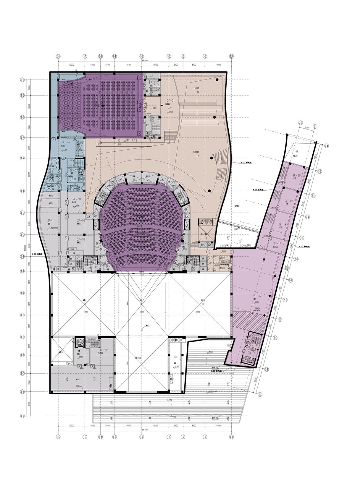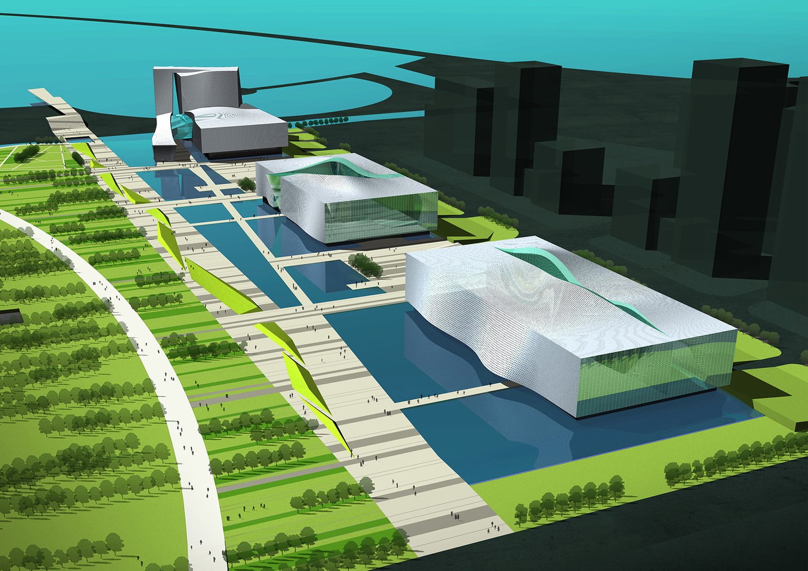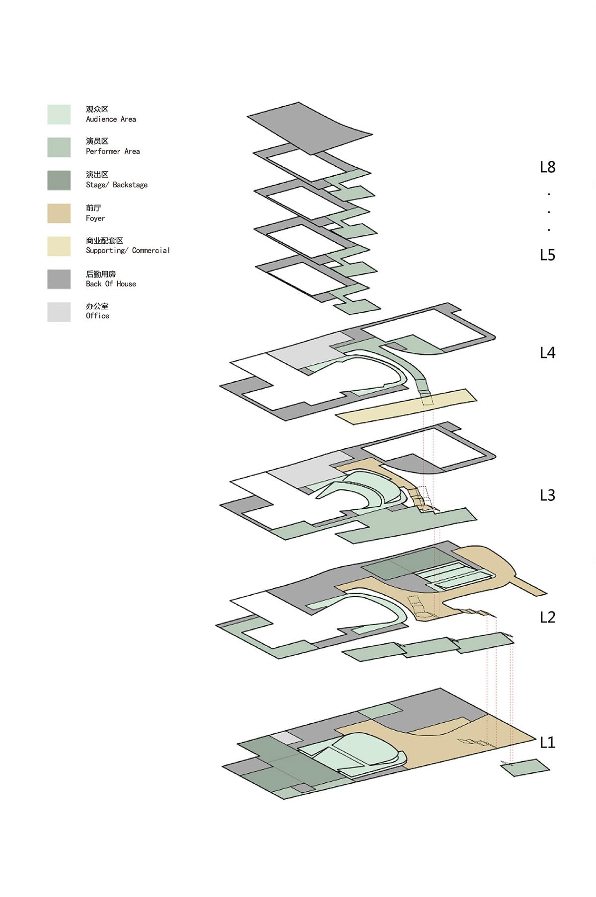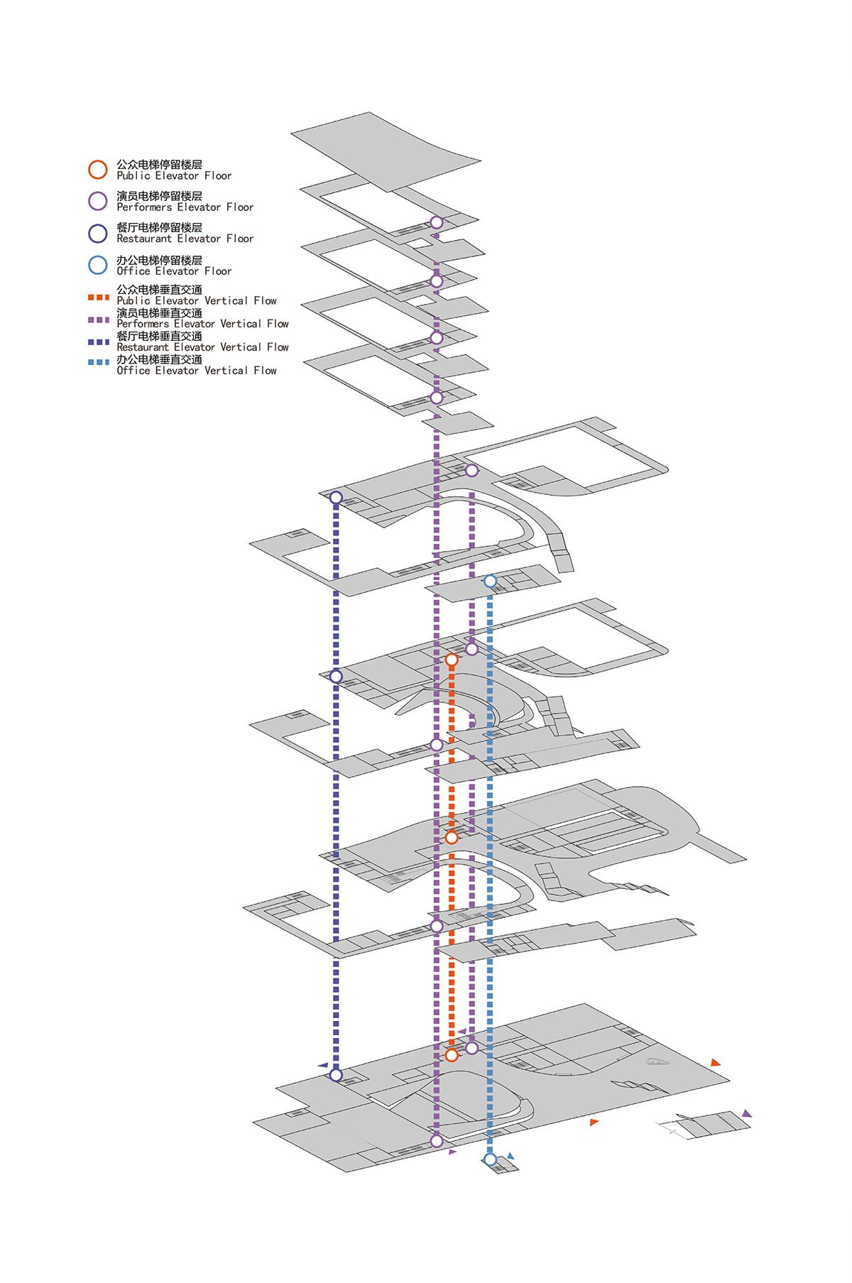 The design takes inspiration from the long and narrow waterfront site. The base of the building is a low-slung, wave-like volume that carries a sense of rhythm and movement along the campus’s axis. A delicately perforated façade hearkens back to ancient Chinese craft like wood and ivory carving and produces dramatic visual effects recalling light shimmering on the bay. The scrim-like envelope modulates transparency according to the spaces it encloses, creating openings at the public lobbies and gathering areas and becoming more opaque at the theatres and rehearsal spaces. While formally and technically innovative, the façade concept is rooted in traditional Chinese building screens and shadow walls.