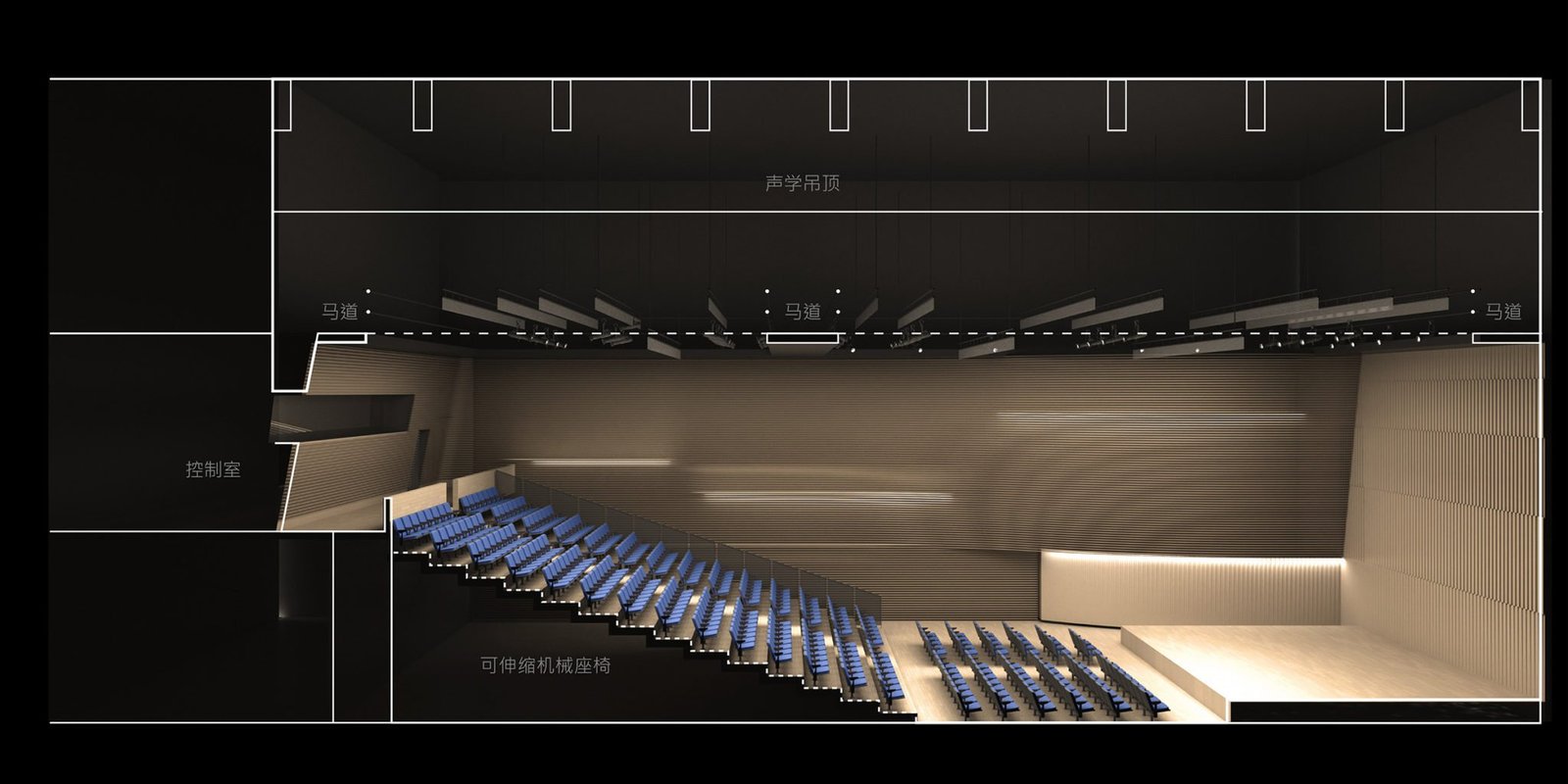A 600-seat theatre complements the main performance hall. This space is designed for flexibility to accommodate experimental productions. The stage and seating can be easily rearranged, enabling a catwalk, a four-sided stage, and immersive, and interactive theatre experiences.