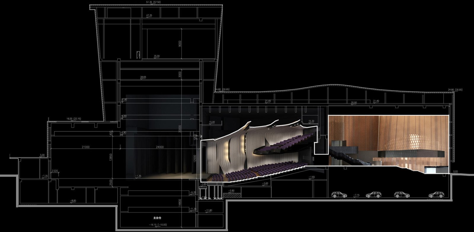 The main performance hall will host high-profile productions of opera, classical music, and ballet. Its delicately sculpted walls accentuate the organic geometries of the space and optimize acoustic conditions by muffling background noise and enhancing sonic clarity. The stage comprises six double-layered lifts that can be raised and lowered within a range of ten meters, opening new production possibilities. The orchestra pool can be raised to the height of the main stage to extend the performance area into the house.
