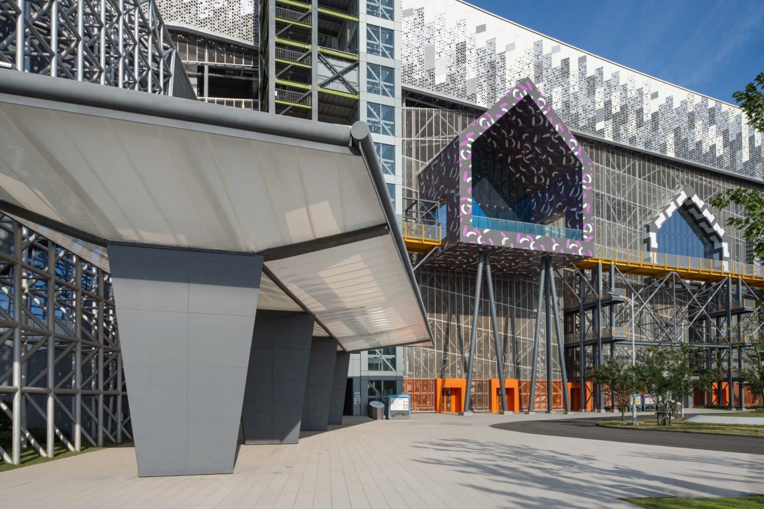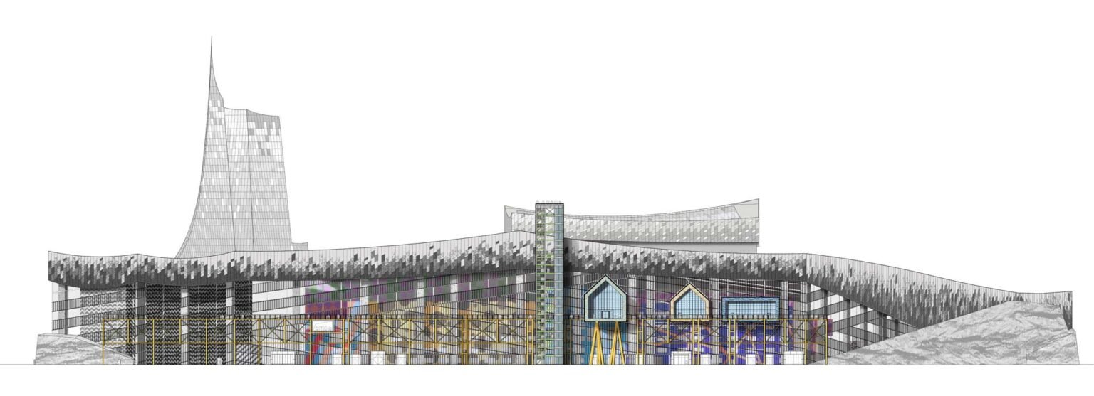 At the visitor’s entrance plaza, patterned structures playfully emerge from the veil of the industrial façade, forming the ‘mini-city’—a vibrant complex of exhibition and leisure spaces. Here, visitors’ journey to the Museum of Waste begins, an immersive experience that takes guests on a journey through natural history and the waste-to-energy (WTE) process.
