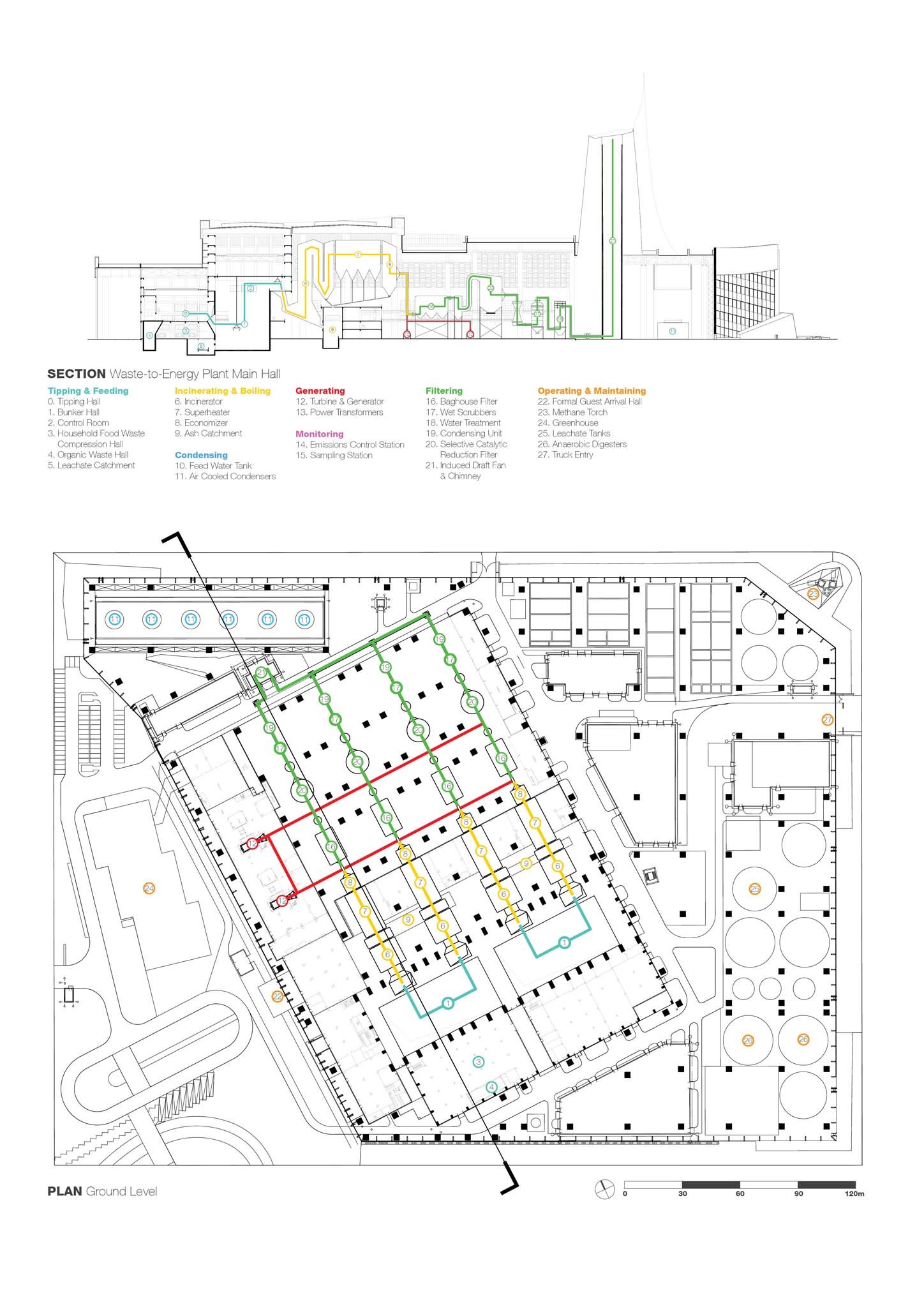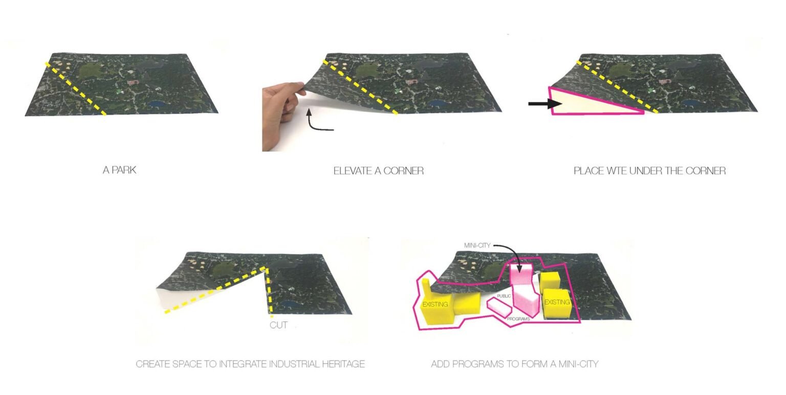 The Baoshan Waste-to-Energy Center presents an innovative leap in waste management by integrating both waste-to-energy incineration and anaerobic digestion facilities. This combination allows for efficient processing of waste, where organic materials are converted into biogas for diverse applications, while non-organic waste is incinerated to generate electricity. This dual approach not only enhances energy recovery but also supports the principles of a circular economy by maximizing resource utilization and minimizing waste. While the integration of additional materials and resources (such as sustaining a park on the roof) may be challenging when evaluated solely against current sustainability standards, BAM’s vision is to establish this project as a transitional prototype. It is an experimental step toward integrating industrial facilities within urban cores, laying the groundwork for future green technologies and contributing to Shanghai’s long-term goal of carbon neutrality by 2060.