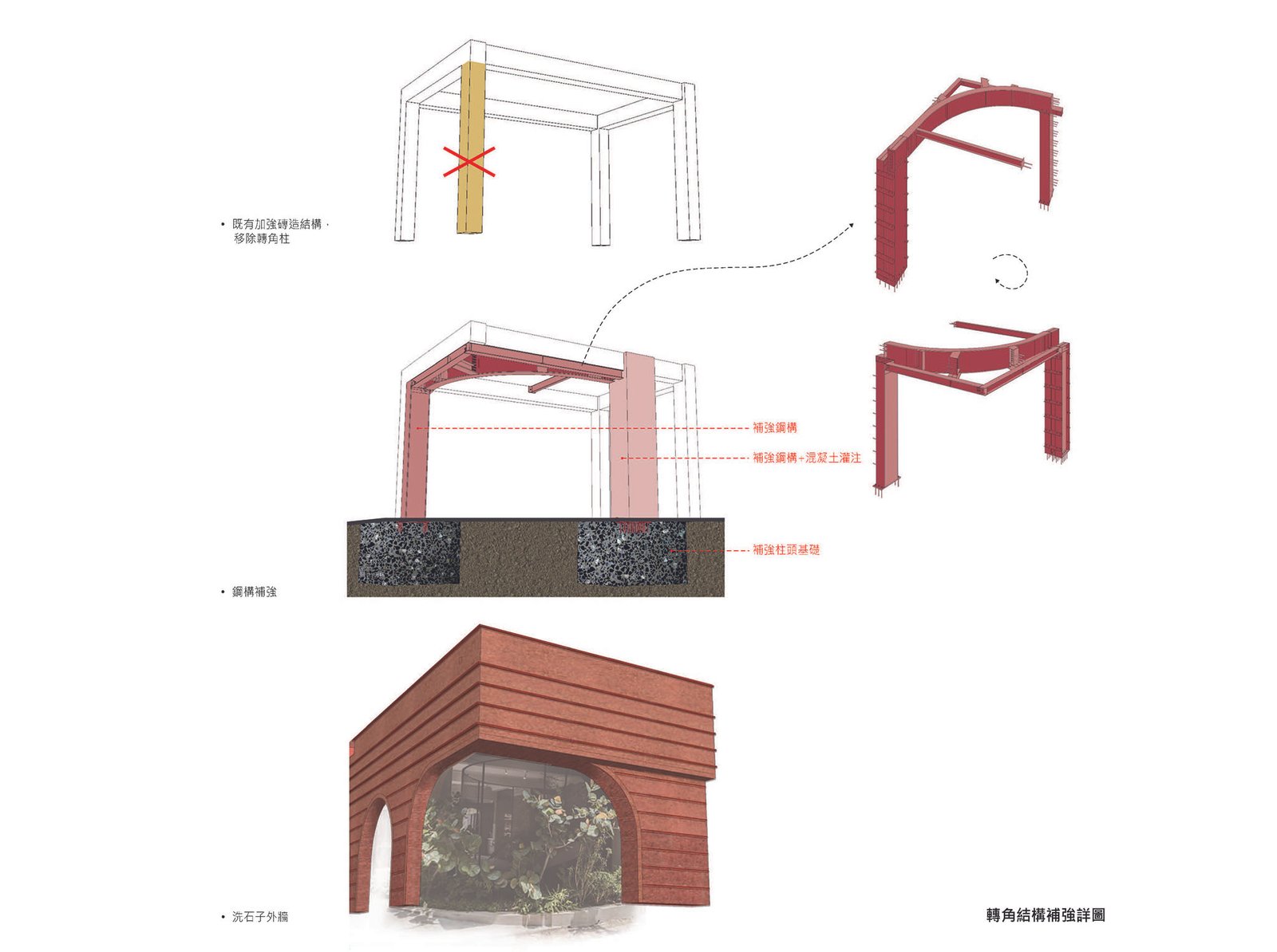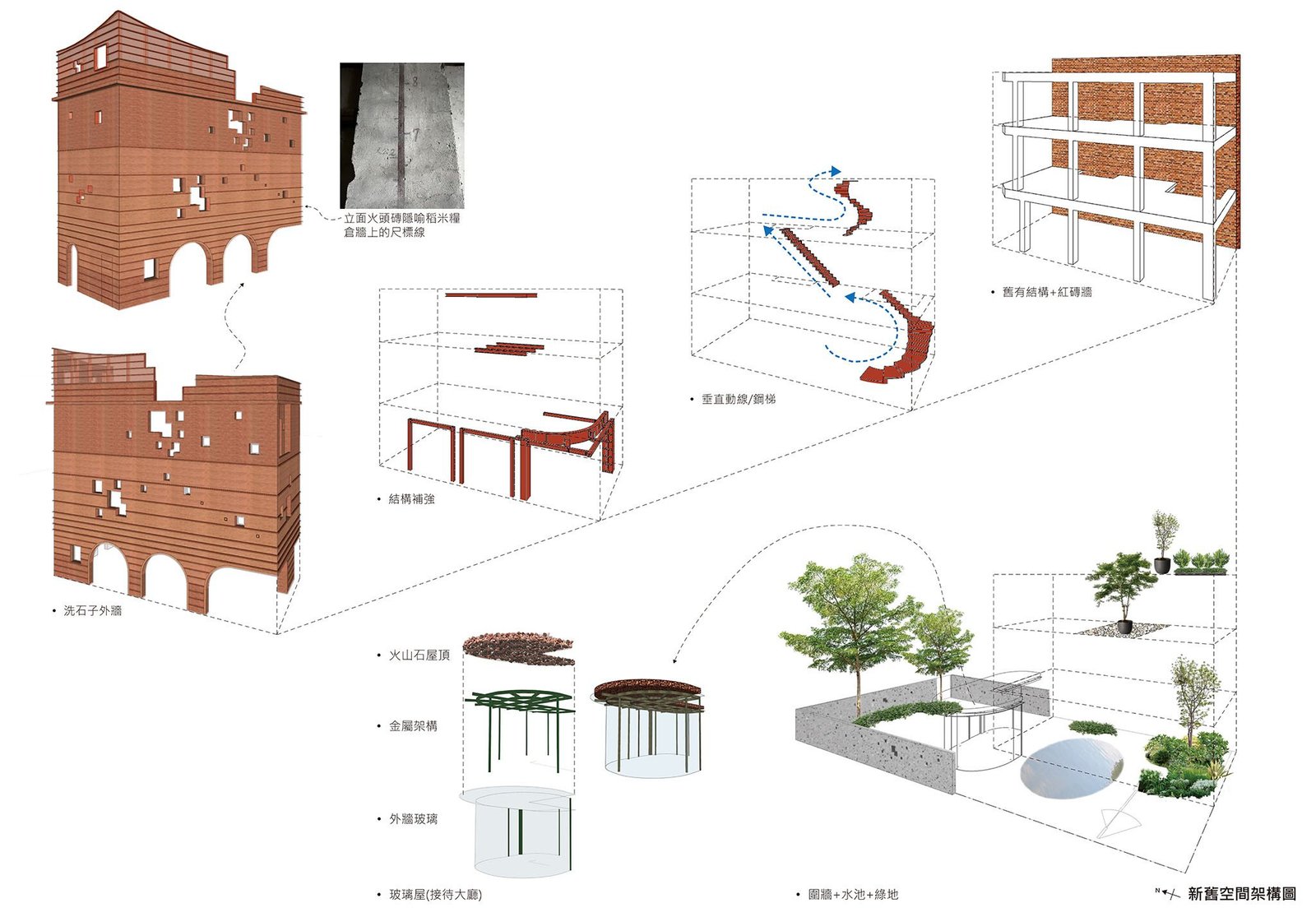 The new exterior wall retains the old wooden beam structure embedded within holes in the brick wall. The ‘voids’ are arranged in an order that follows the shape of the old roof. By recreating 51 voids, let the wind, light, and plants pass through freely and even become a space for birds to rest.