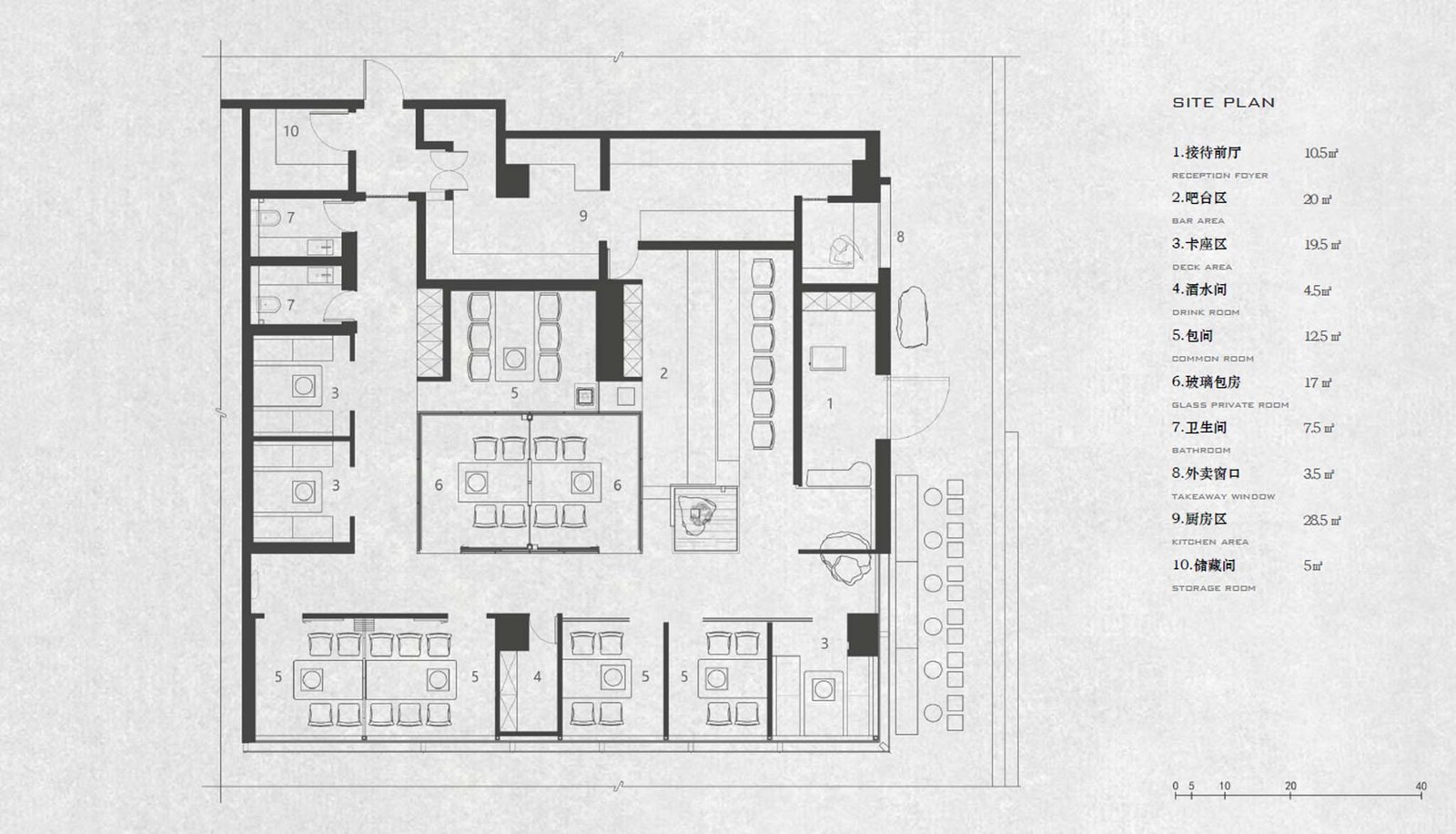 Beside the bar counter, there is a concise yet powerful thick rock slab, with a lush pine bonsai placed on it. Objects in the space are touched by light and shadows and carry the traces of time and a sense of warmth, hence endowing the space with a poetic yet lively atmosphere and natural vitality.