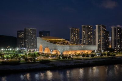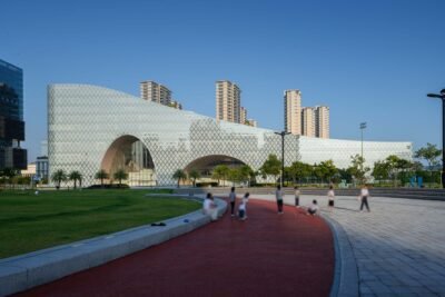 The site of the Hengqin Culture & Art Complex is wedged between existing residential towers and an open city park, and Atelier Apeiron devised a strategy for creating an energetic complex capable of accommodating a multifunctional future. As part of that strategy, the firm espoused an architectural approach defined by large-scale porosity, adapted to the high-density urban context of the site’s surroundings.