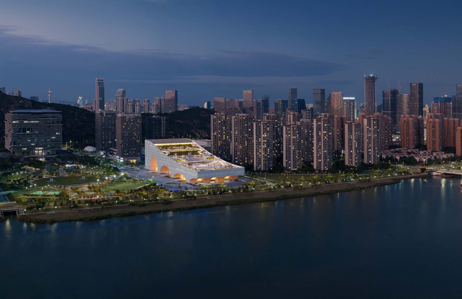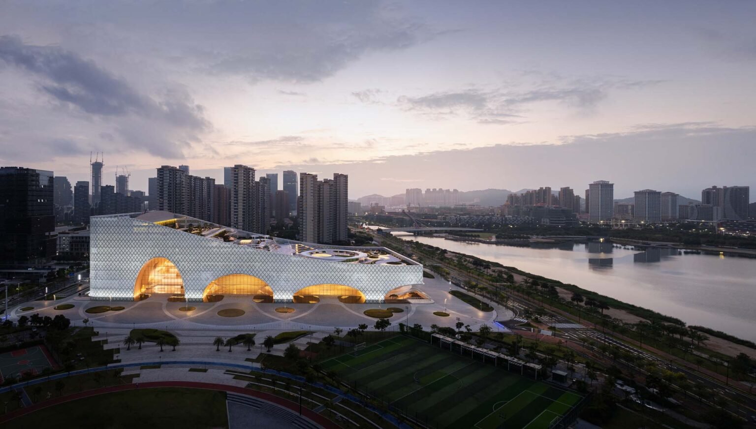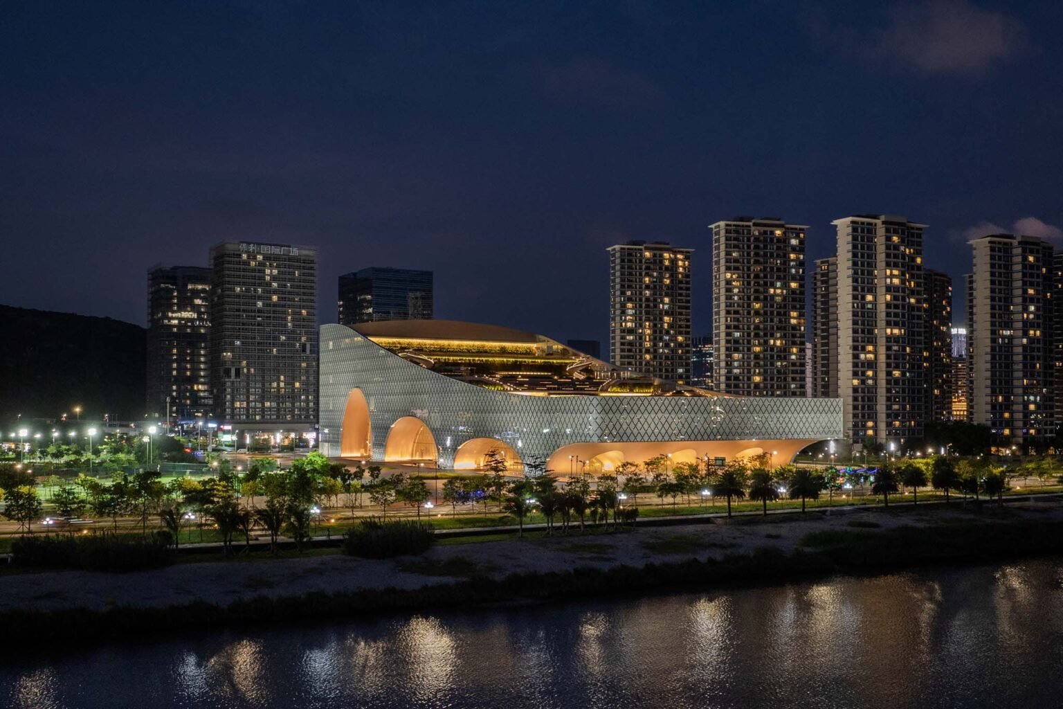 Extending from a hill to the north, to a river to the south, the catenary curve of the Hengqin Culture & Art Complex has created a new skyline landmark.