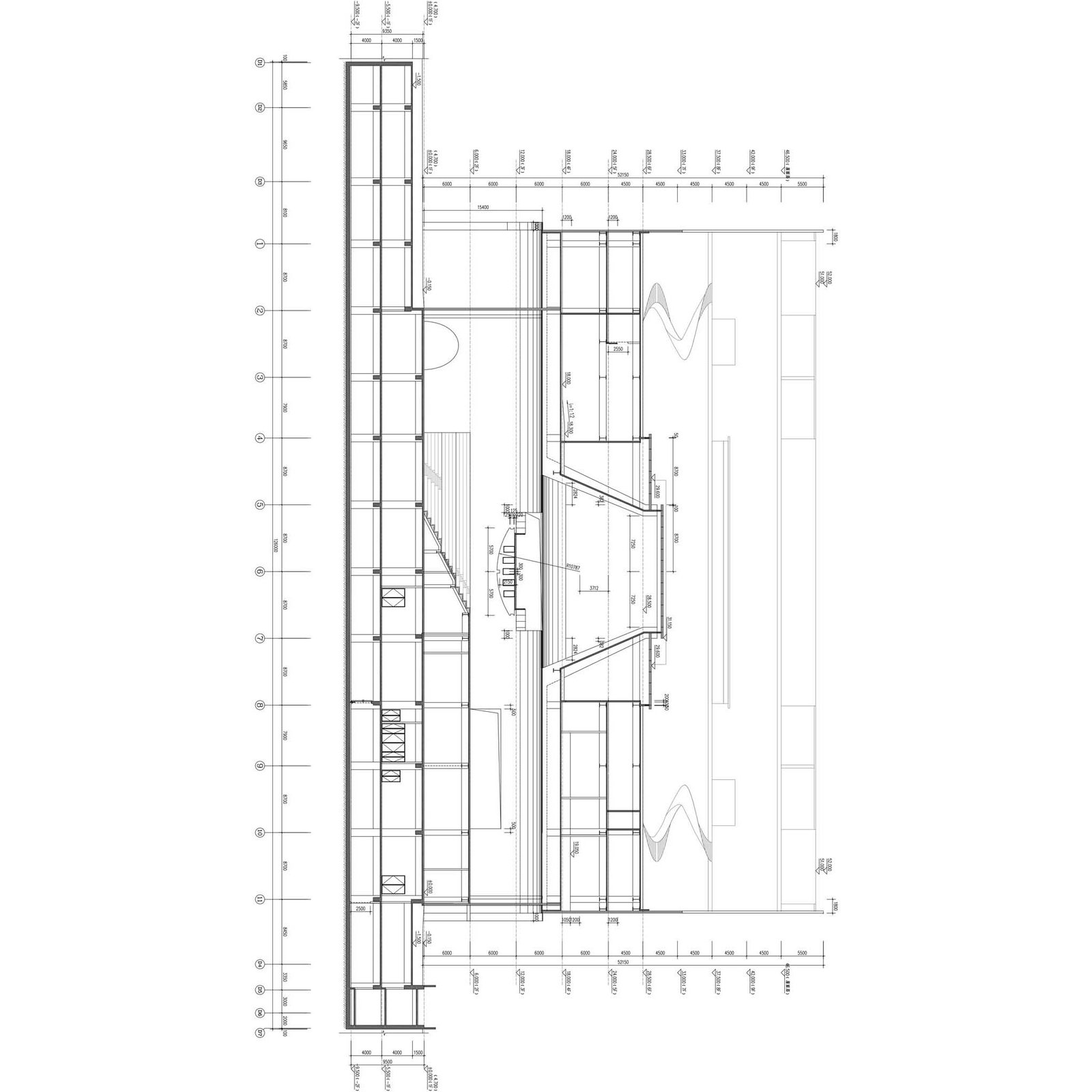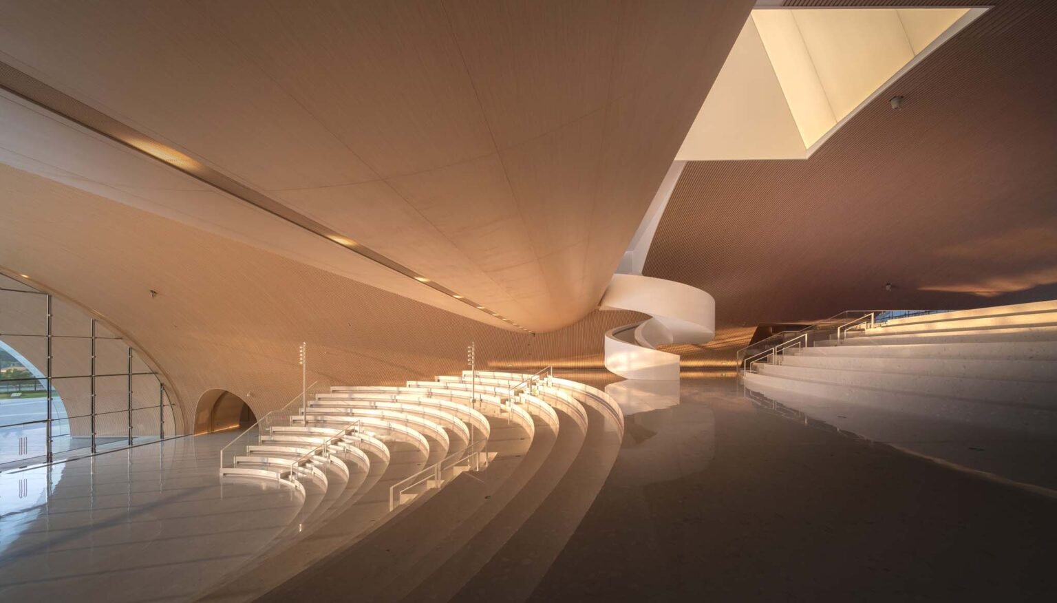 The unique setting of the Hengqin Culture & Art Complex was not without its challenges. The region’s status as a typhoon-prone area in summer was a challenge requiring special considerations, including numerous wind-resistant material comparisons before deciding upon a light and flexible suspended glass curtain wall as a particularly efficient solution. Another challenging element was how to introduce natural light into such large volumes.