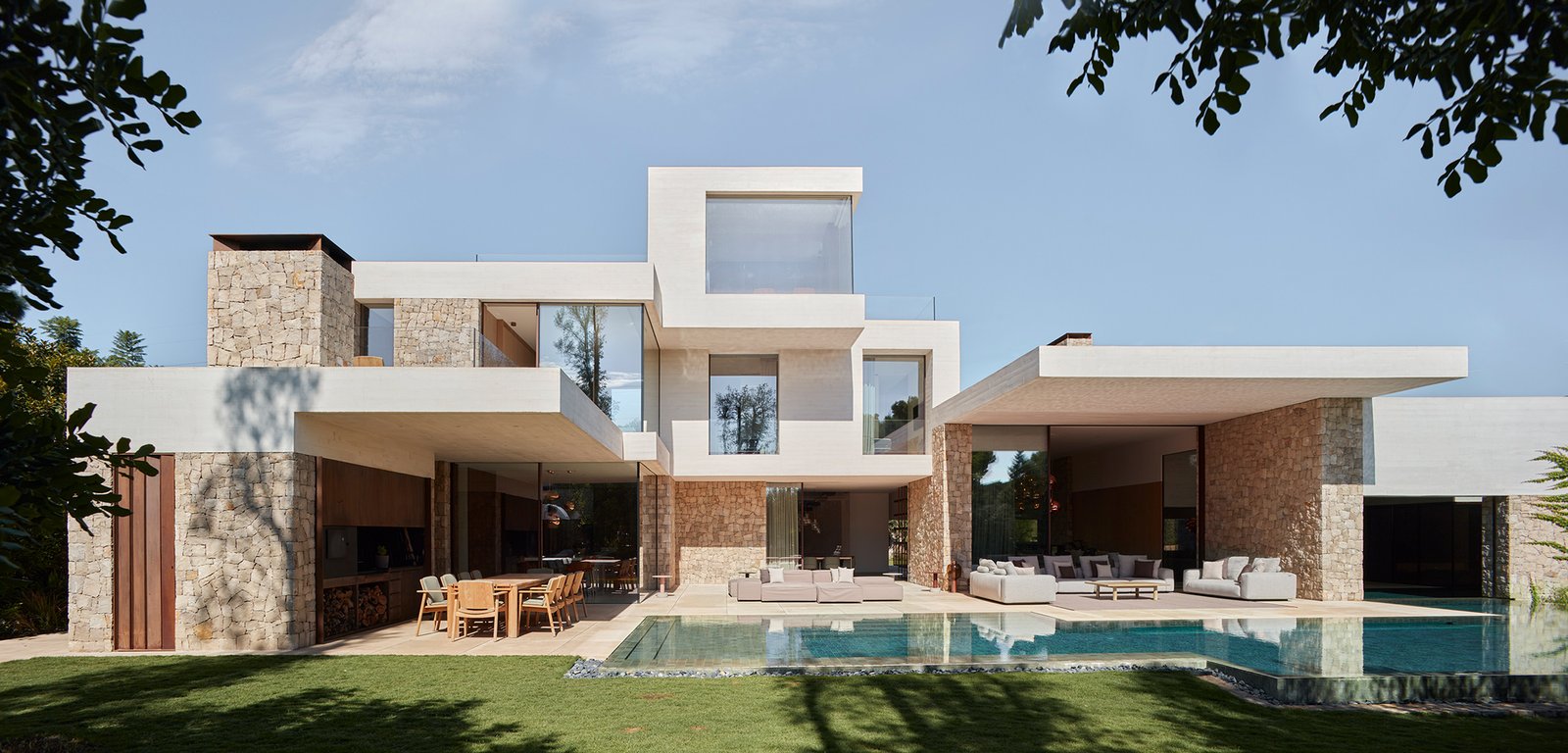 The stone plinth is topped by a white concrete trim, cast in such a way that the two materials form an expressive, complementary set that provides the house with a strong tectonic character.