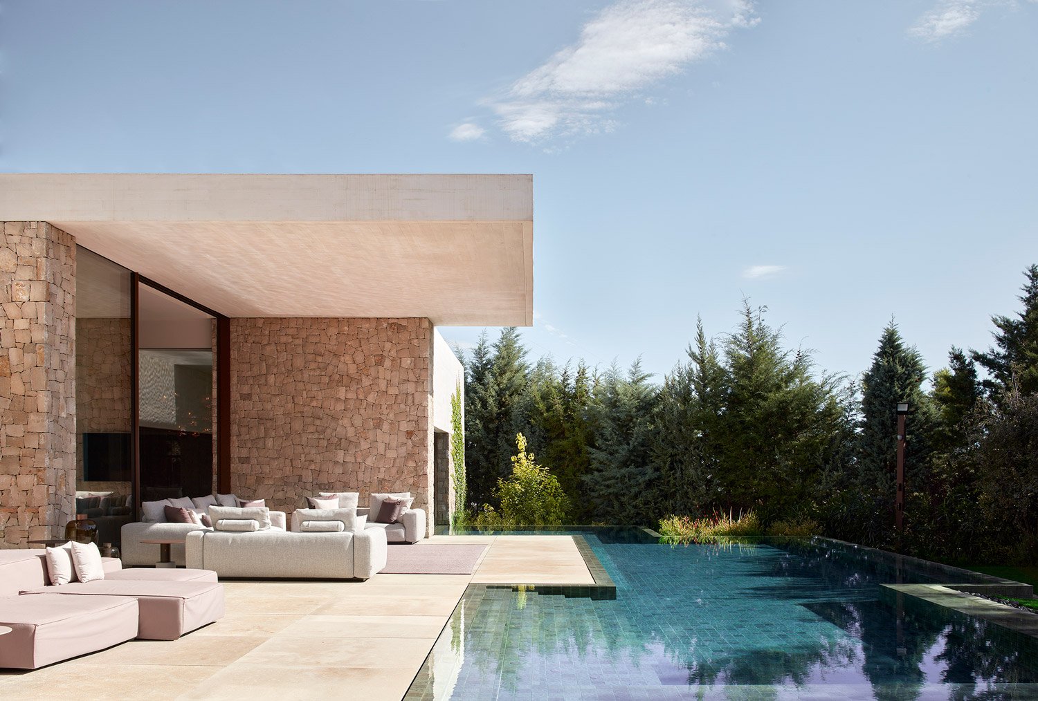 We access the house through the setback between two of the pieces. The ground floor opens to both sides of the plot, while the pool area is more open and passable. On the other hand, the views from the back garden are more controlled and
