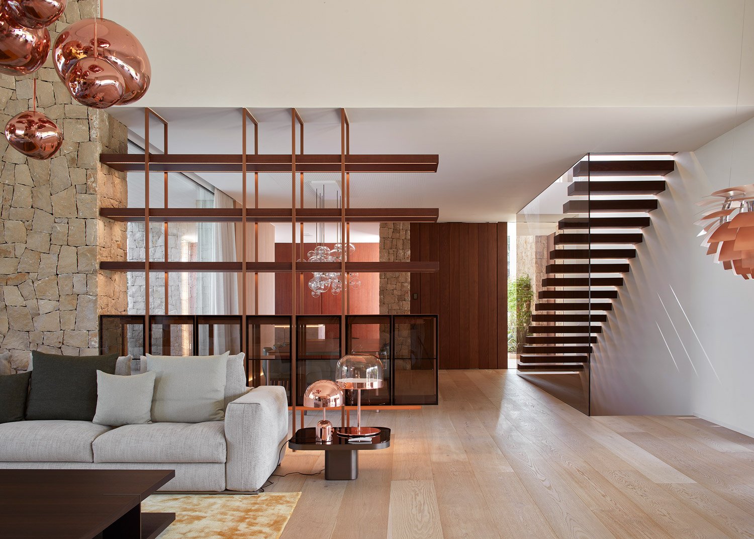 The ground floor hosts the rooms for daily use as a kitchen, dining room, and double-height living room, to which are attached guests’ pavilion, a cinema room, and an indoor pool. The bedrooms and the lookout, dedicated to the studio area, are hosted on the first floor.