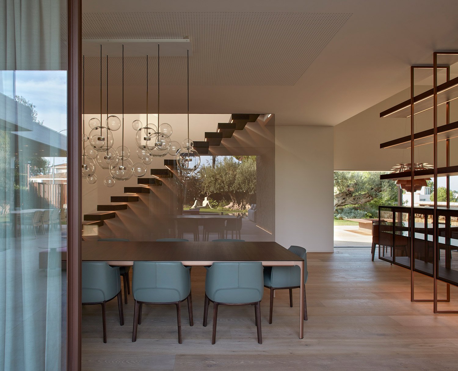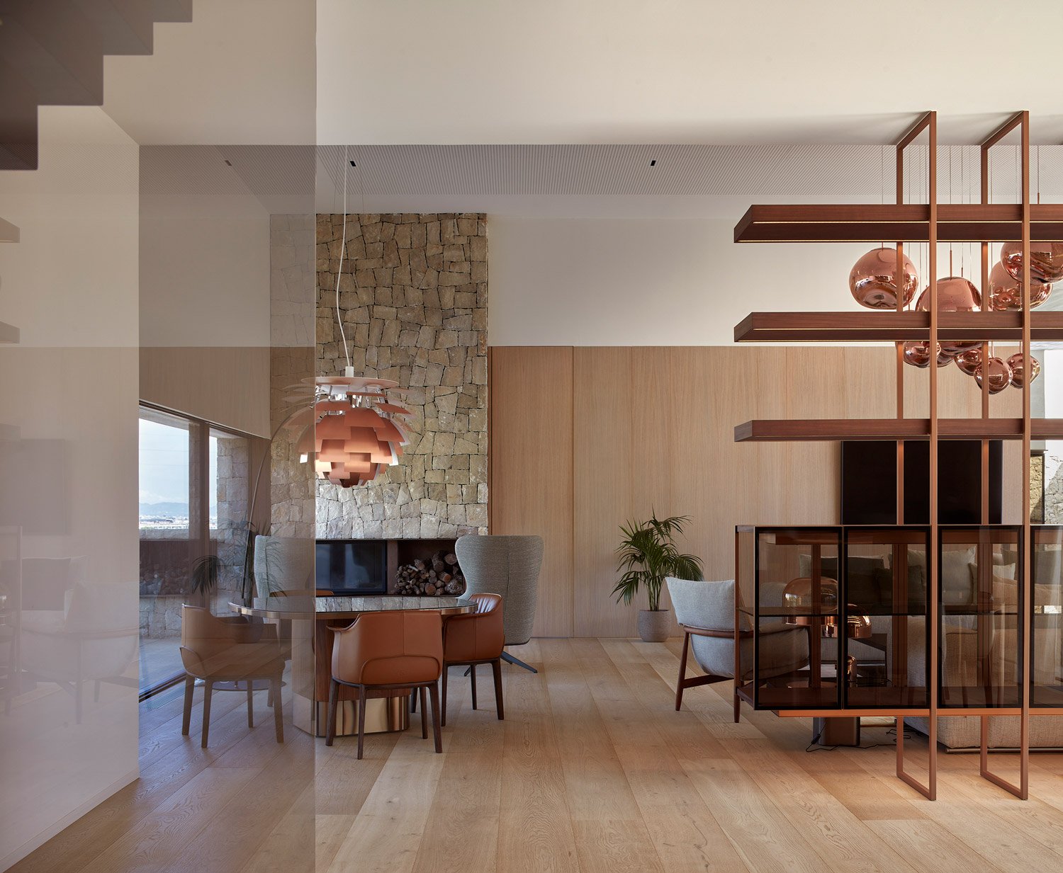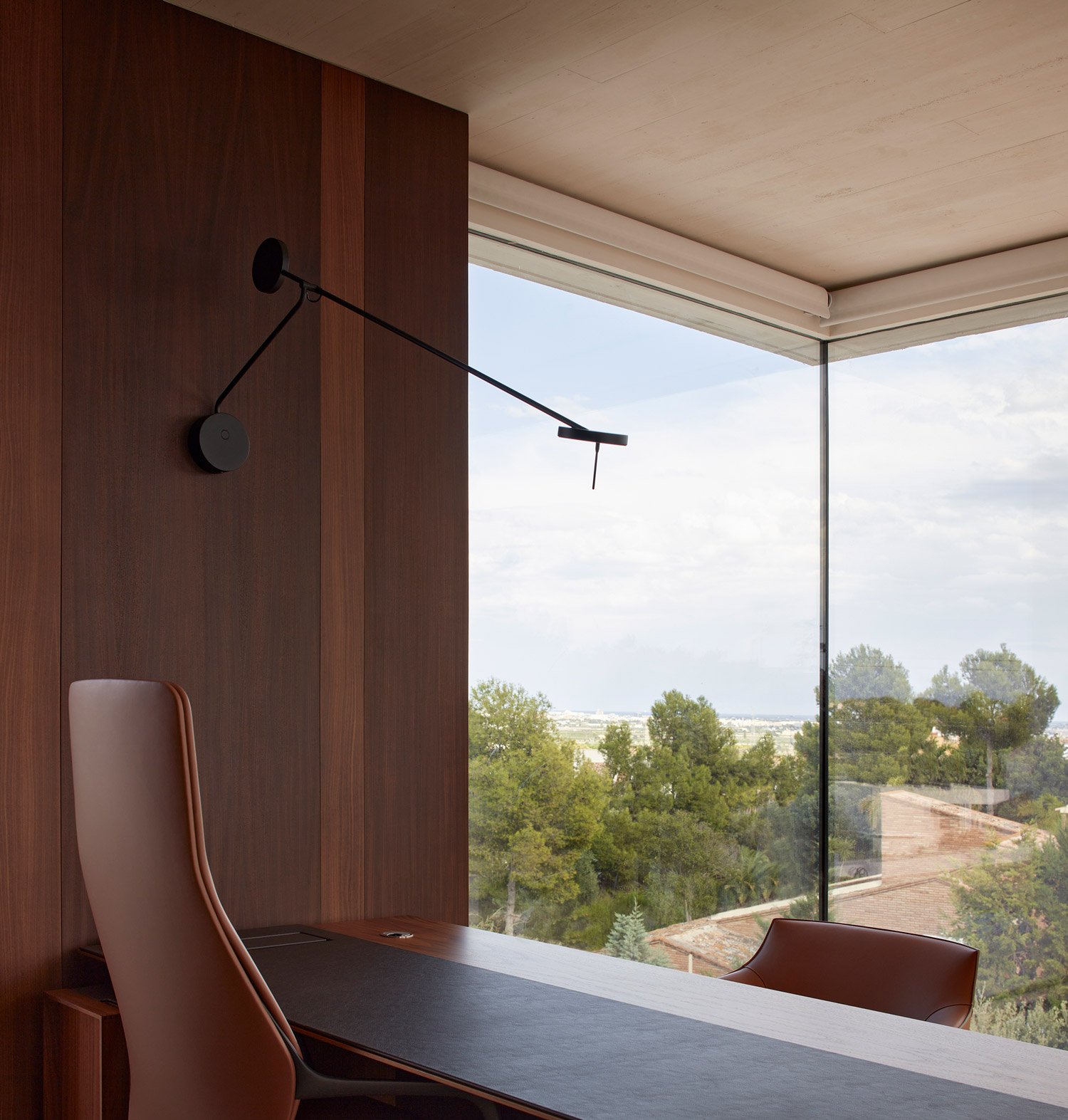 The ground floor hosts the rooms for daily use as a kitchen, dining room, and double-height living room, to which are attached guests’ pavilion, a cinema room, and an indoor pool. The bedrooms and the lookout, dedicated to the studio area, are hosted on the first floor.