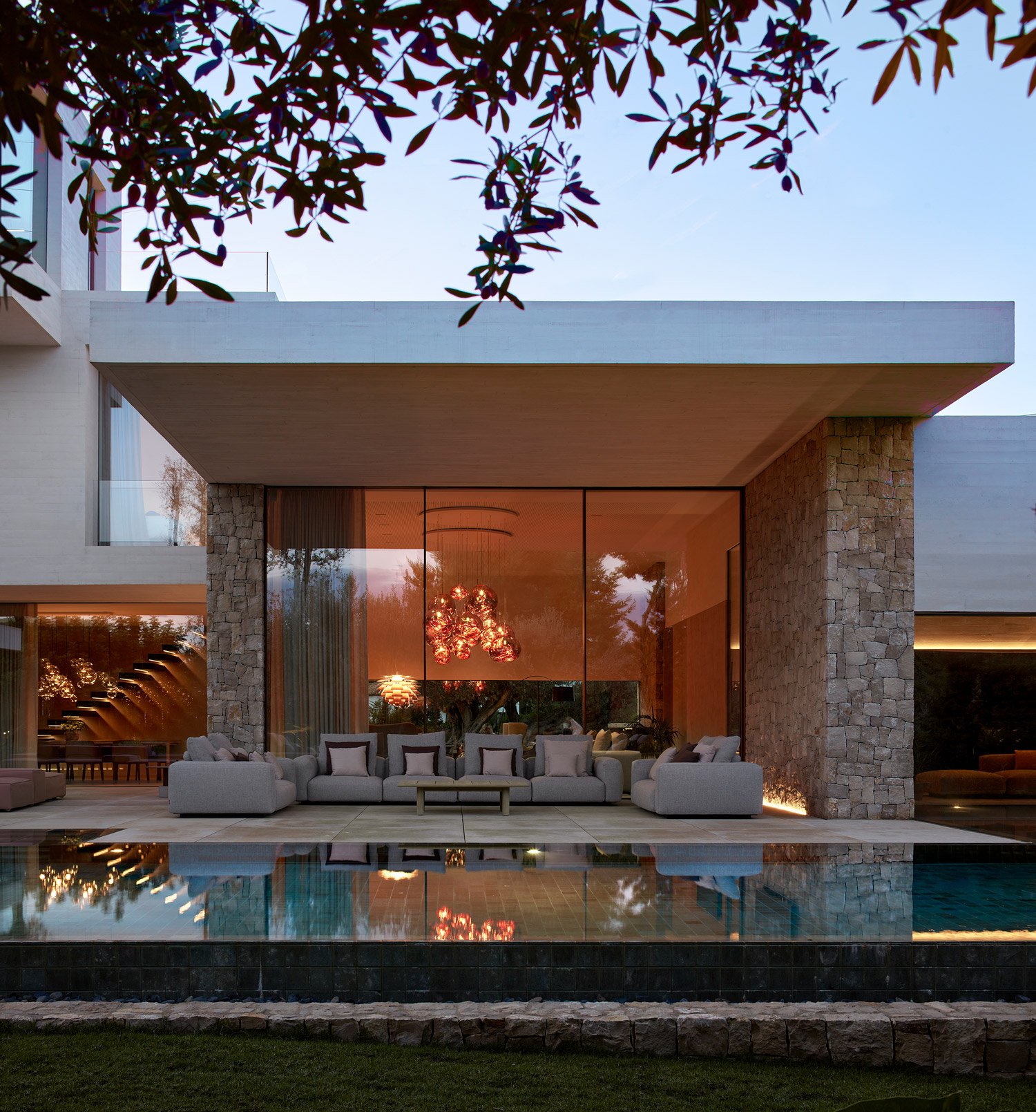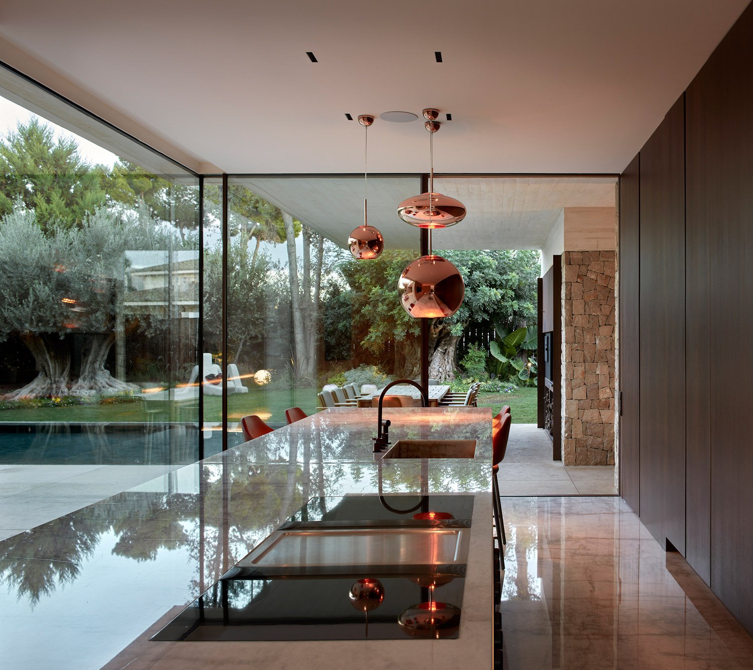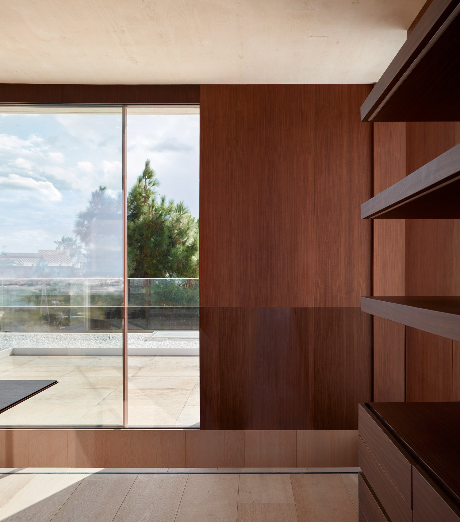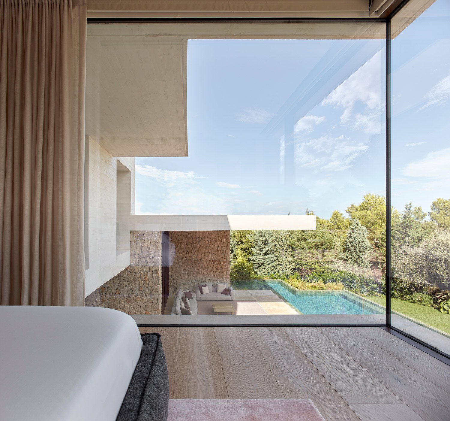 Water is an important element here, thus linking the indoor and outdoor pool to the rooms. A sliding window hidden by a wall when it is opened, becomes the link between them, thus enhancing their continuity. The slot on the