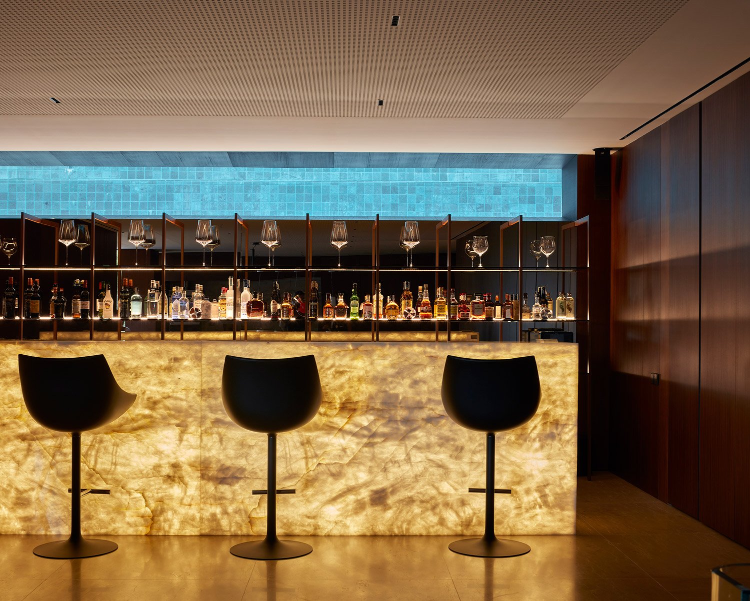 swimming pool allows access to natural light in the basement and projects the reflections on the water.