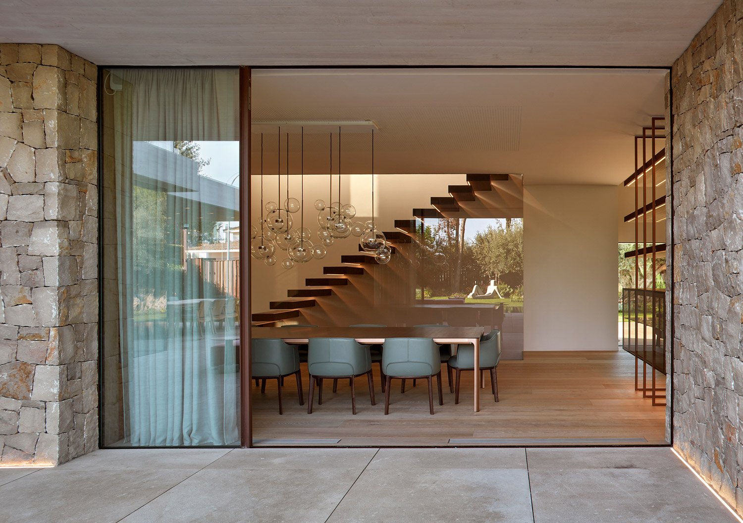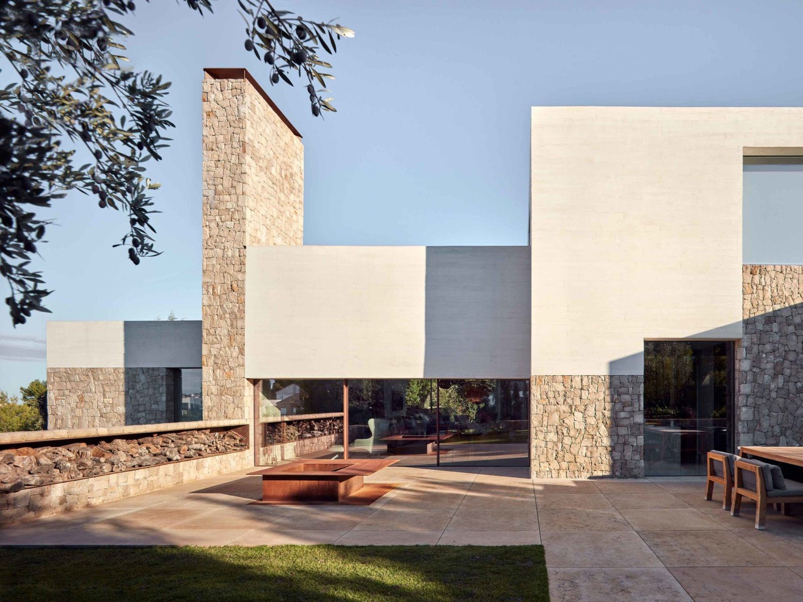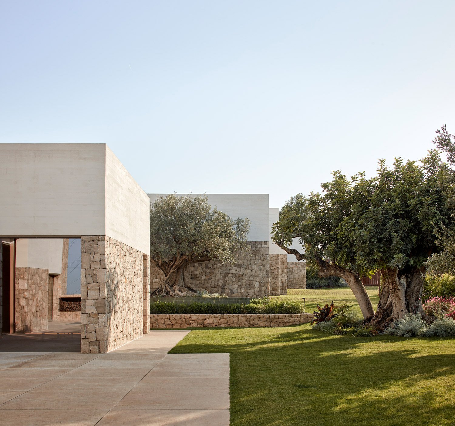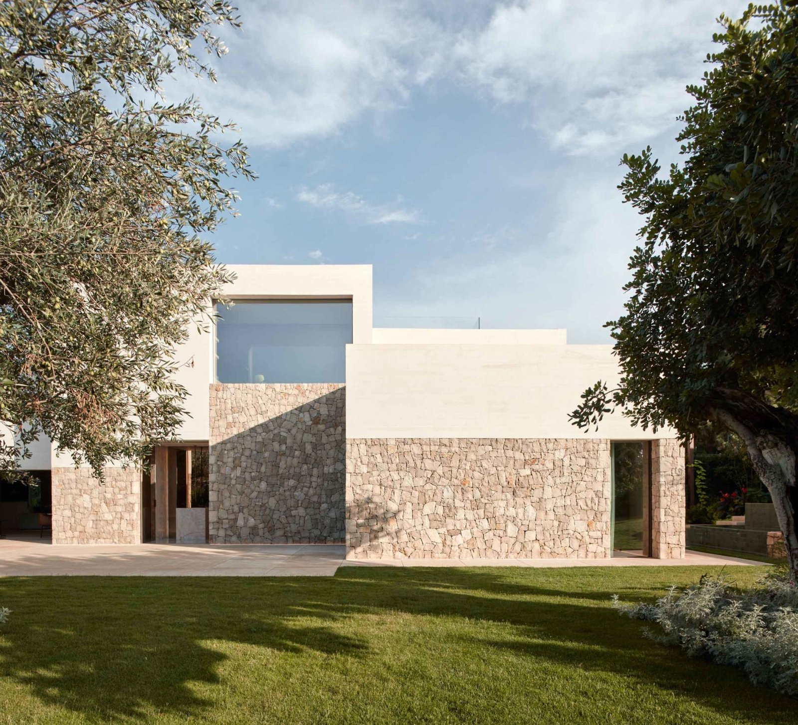 The stone plinth is topped by a white concrete trim, cast in such a way that the two materials form an expressive, complementary set that provides the house with a strong tectonic character.