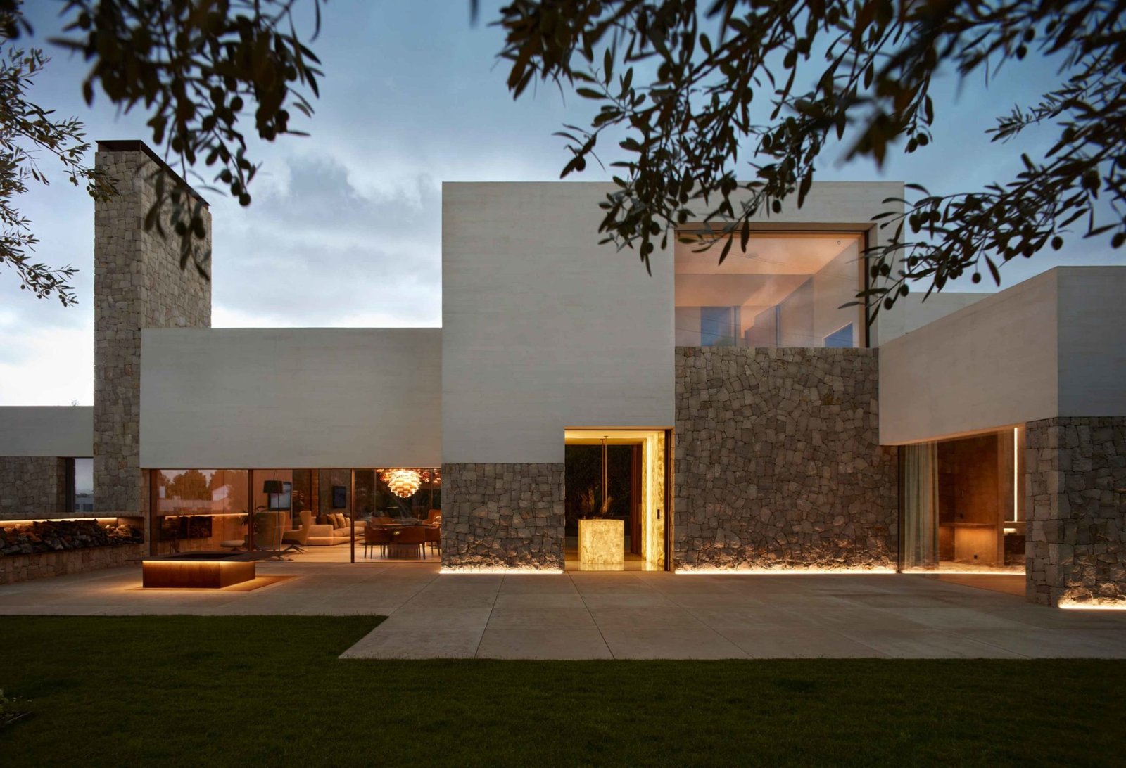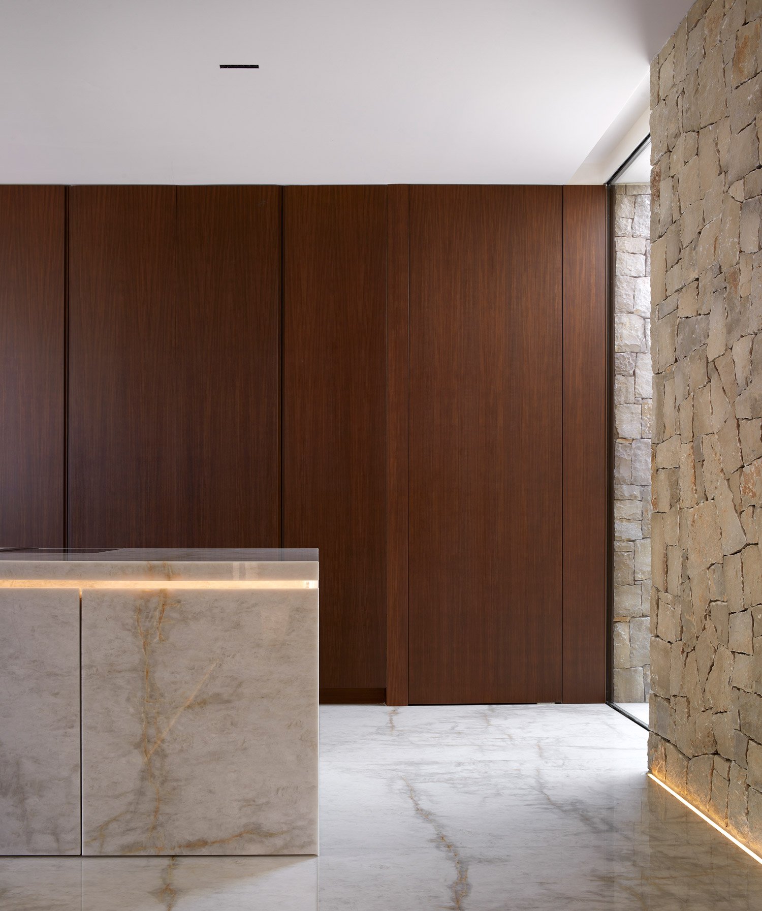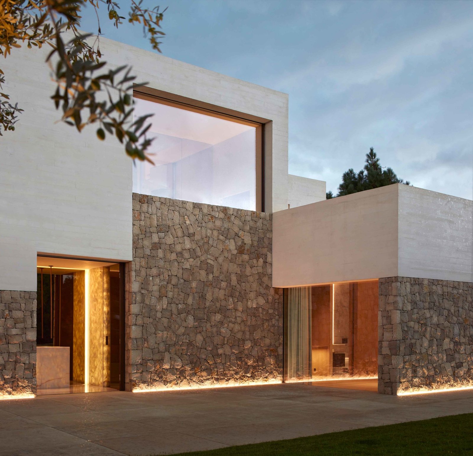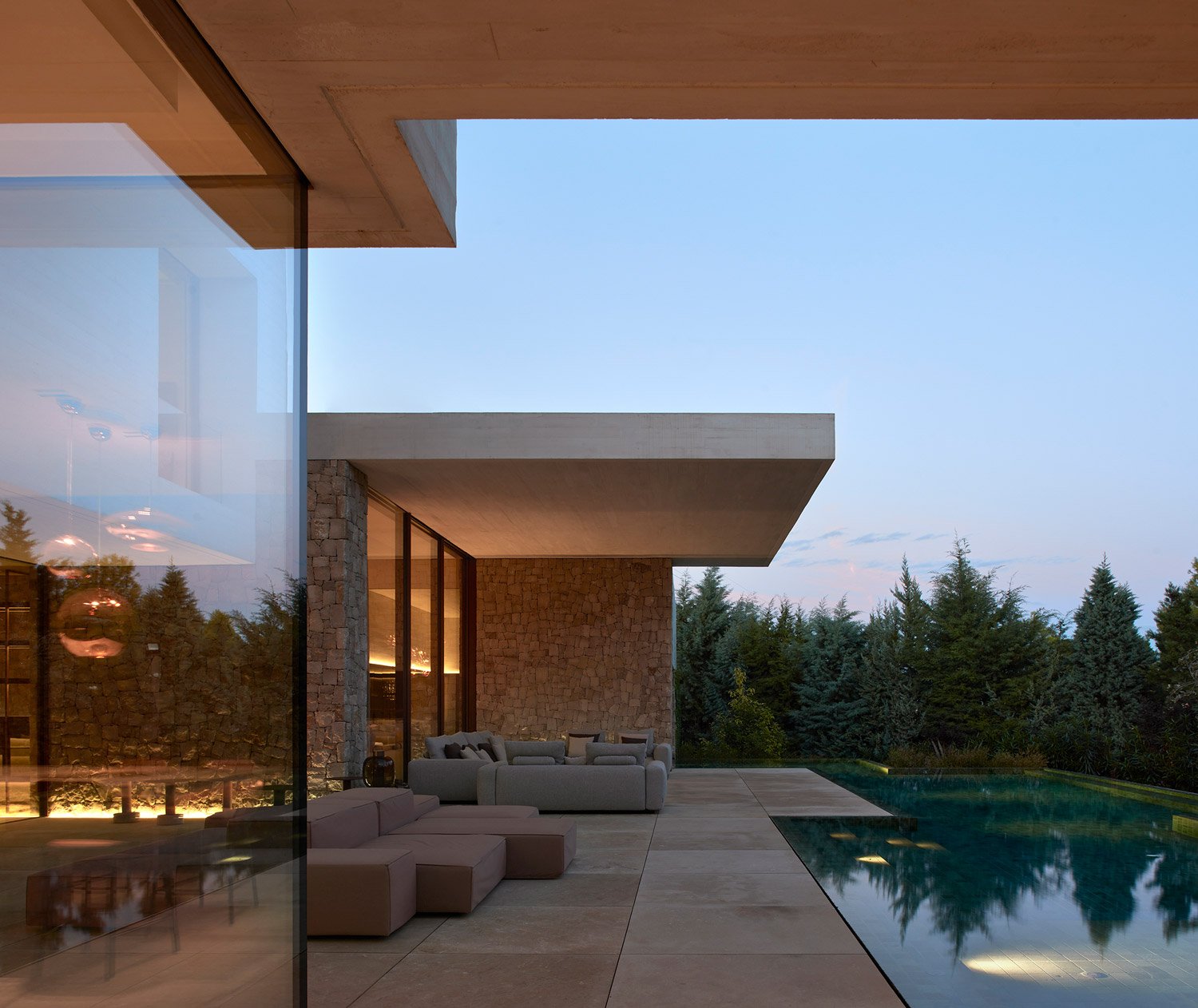 The stone plinth is topped by a white concrete trim, cast in such a way that the two materials form an expressive, complementary set that provides the house with a strong tectonic character.