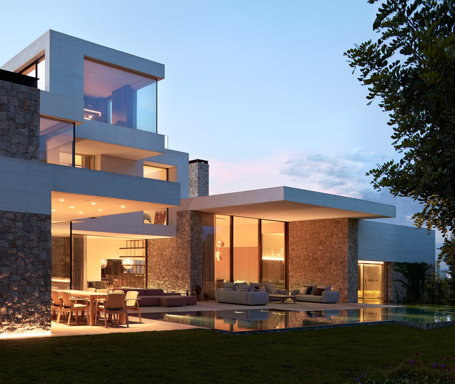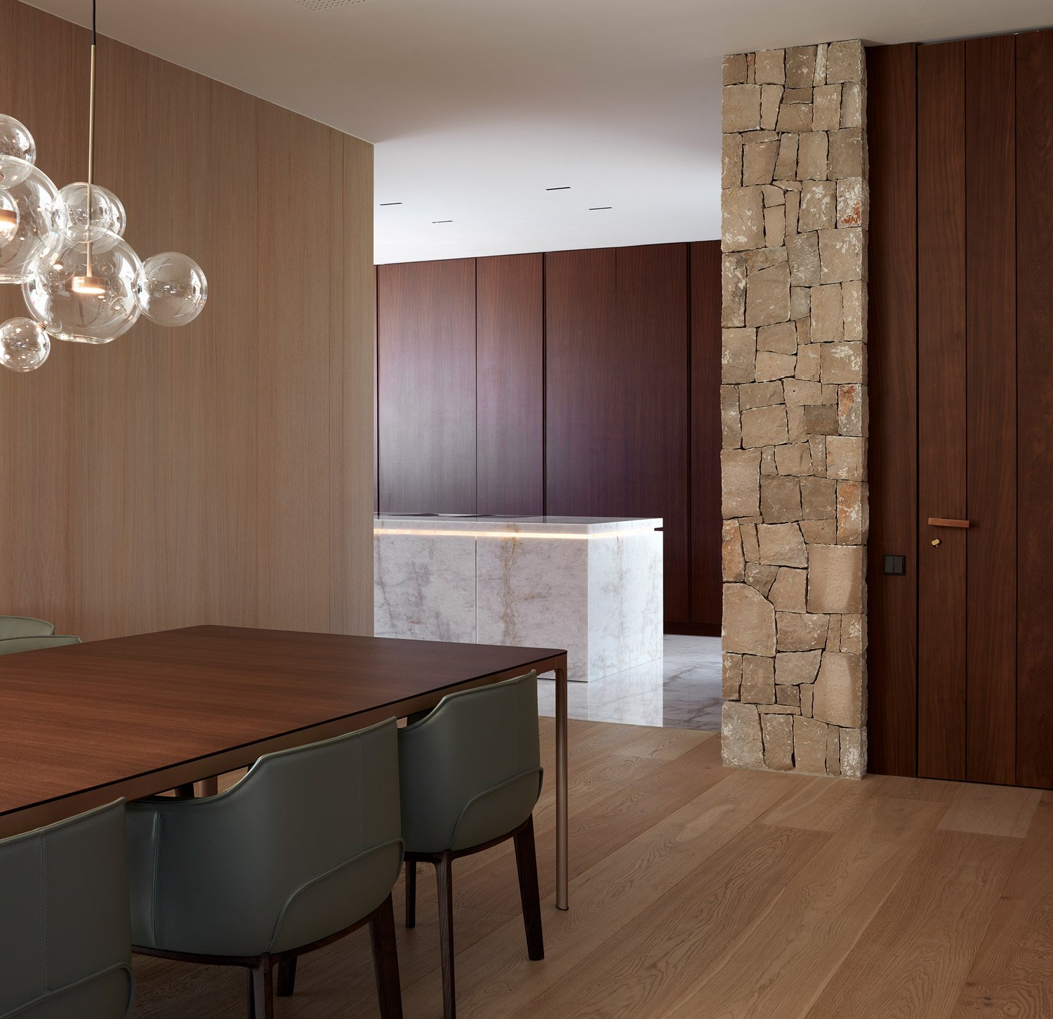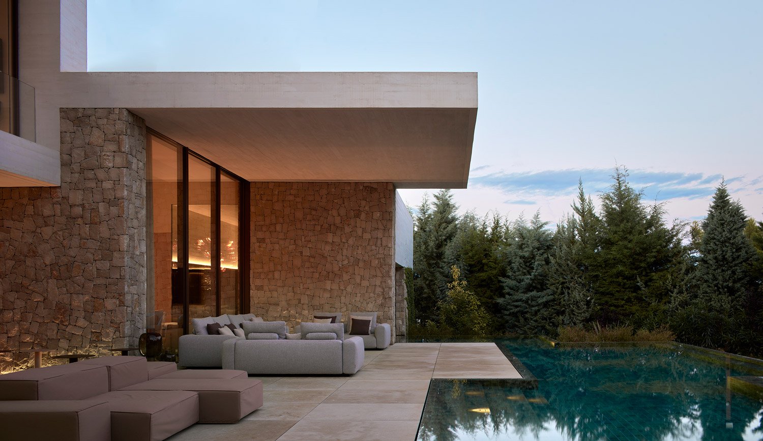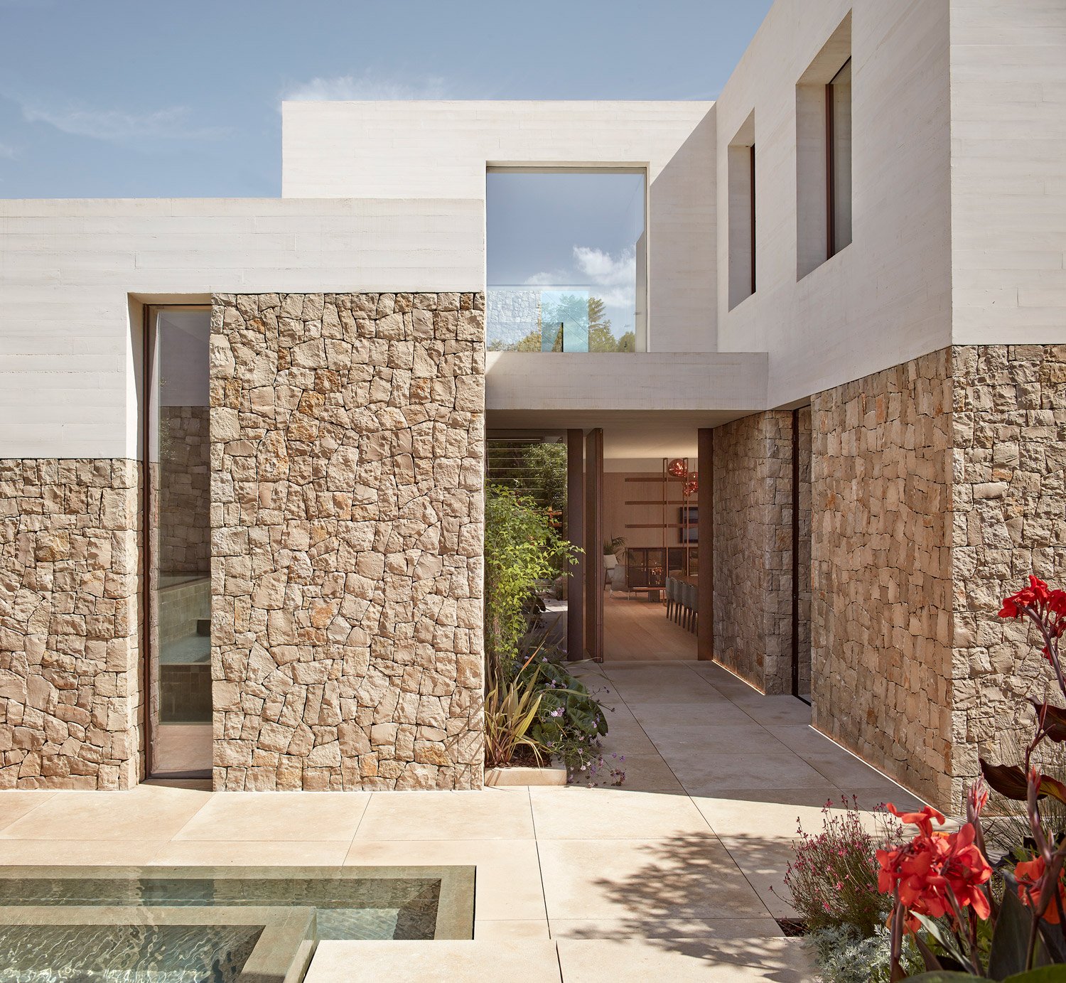 The stone plinth is topped by a white concrete trim, cast in such a way that the two materials form an expressive, complementary set that provides the house with a strong tectonic character.