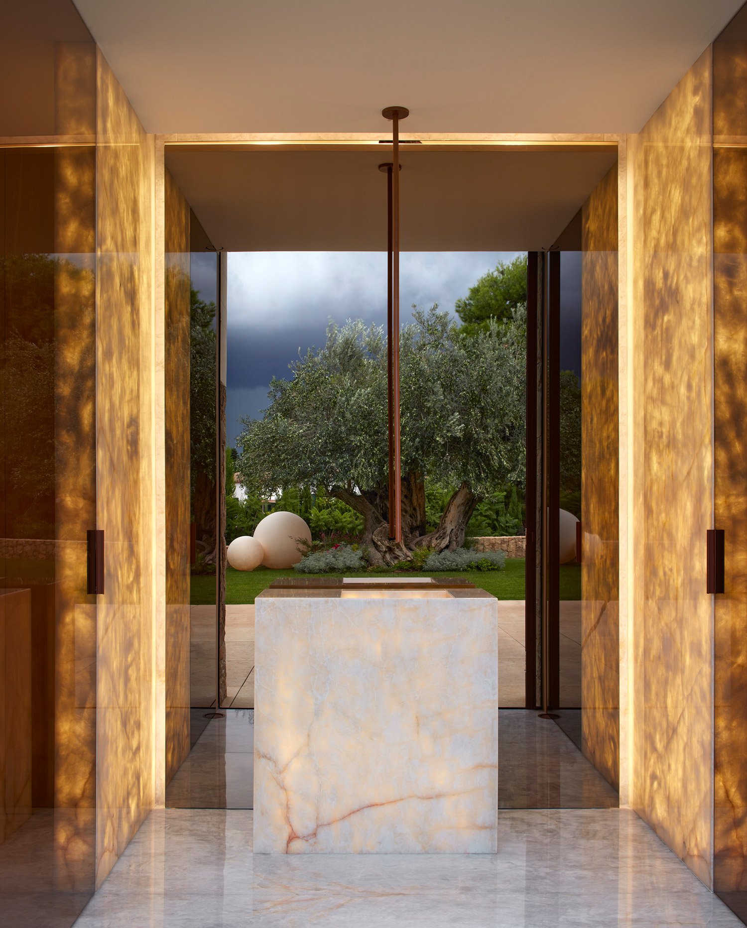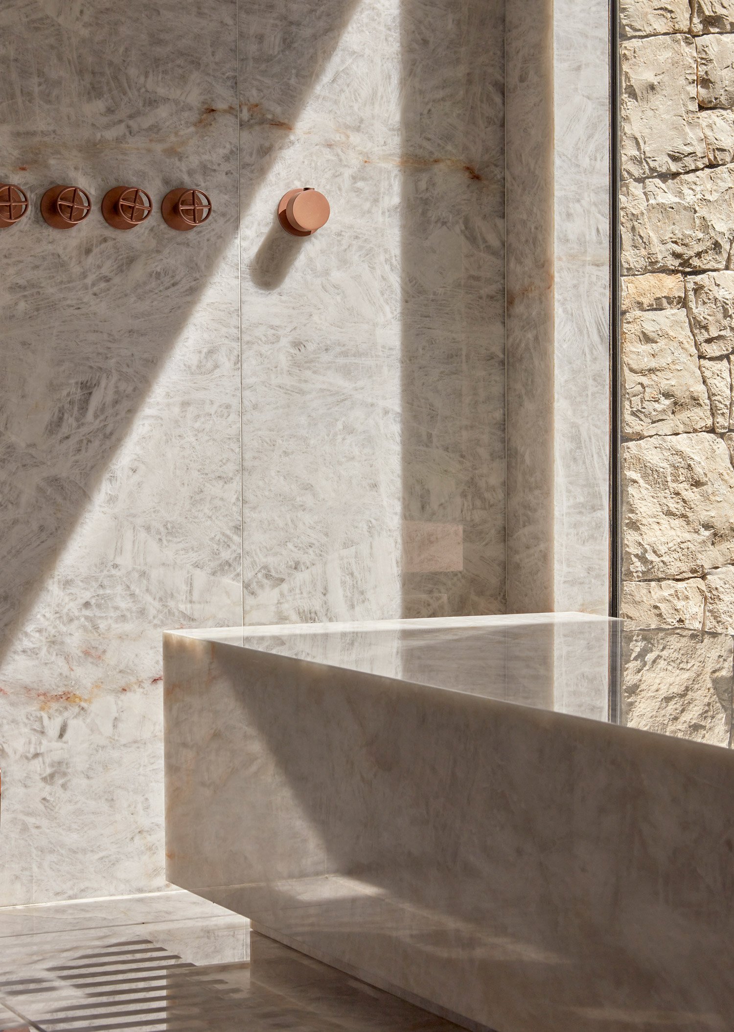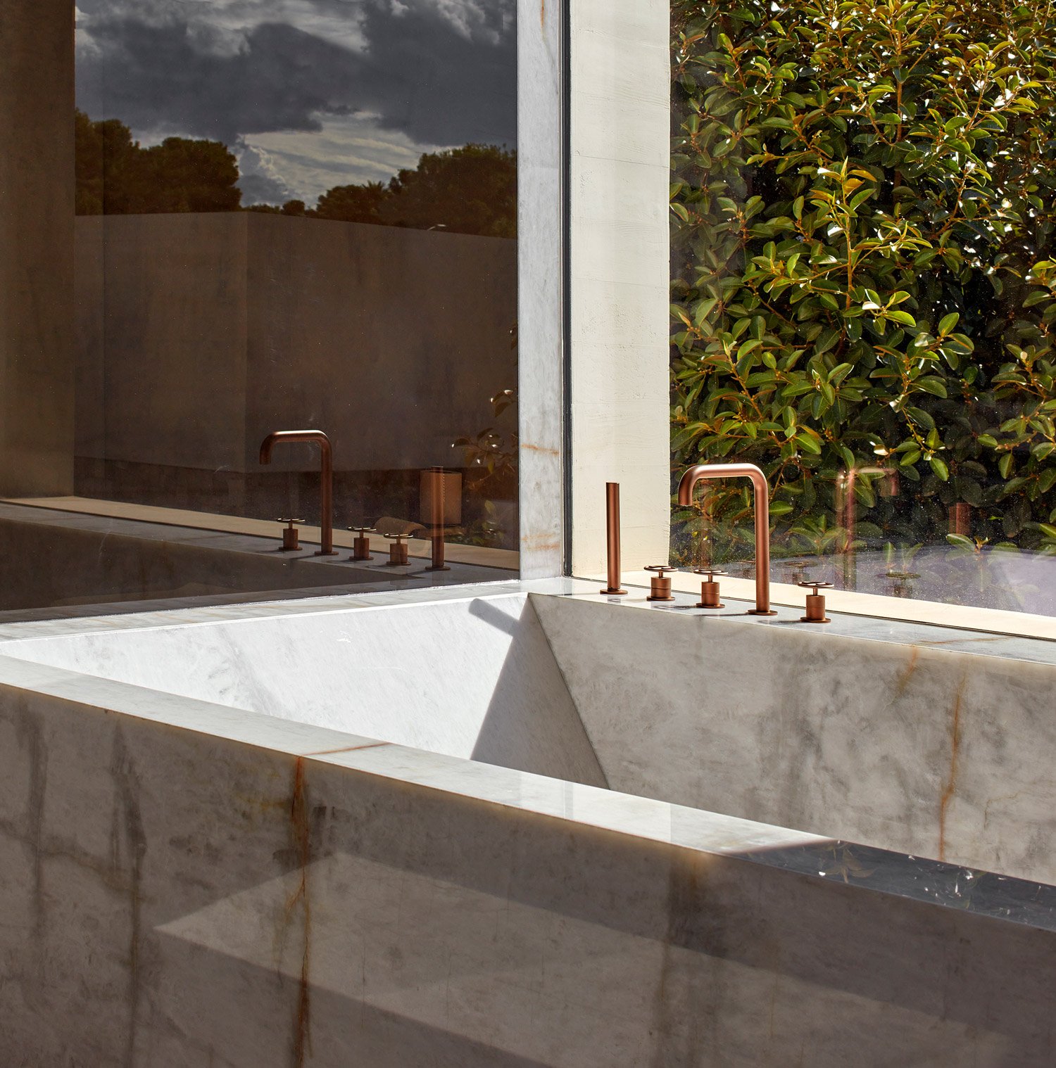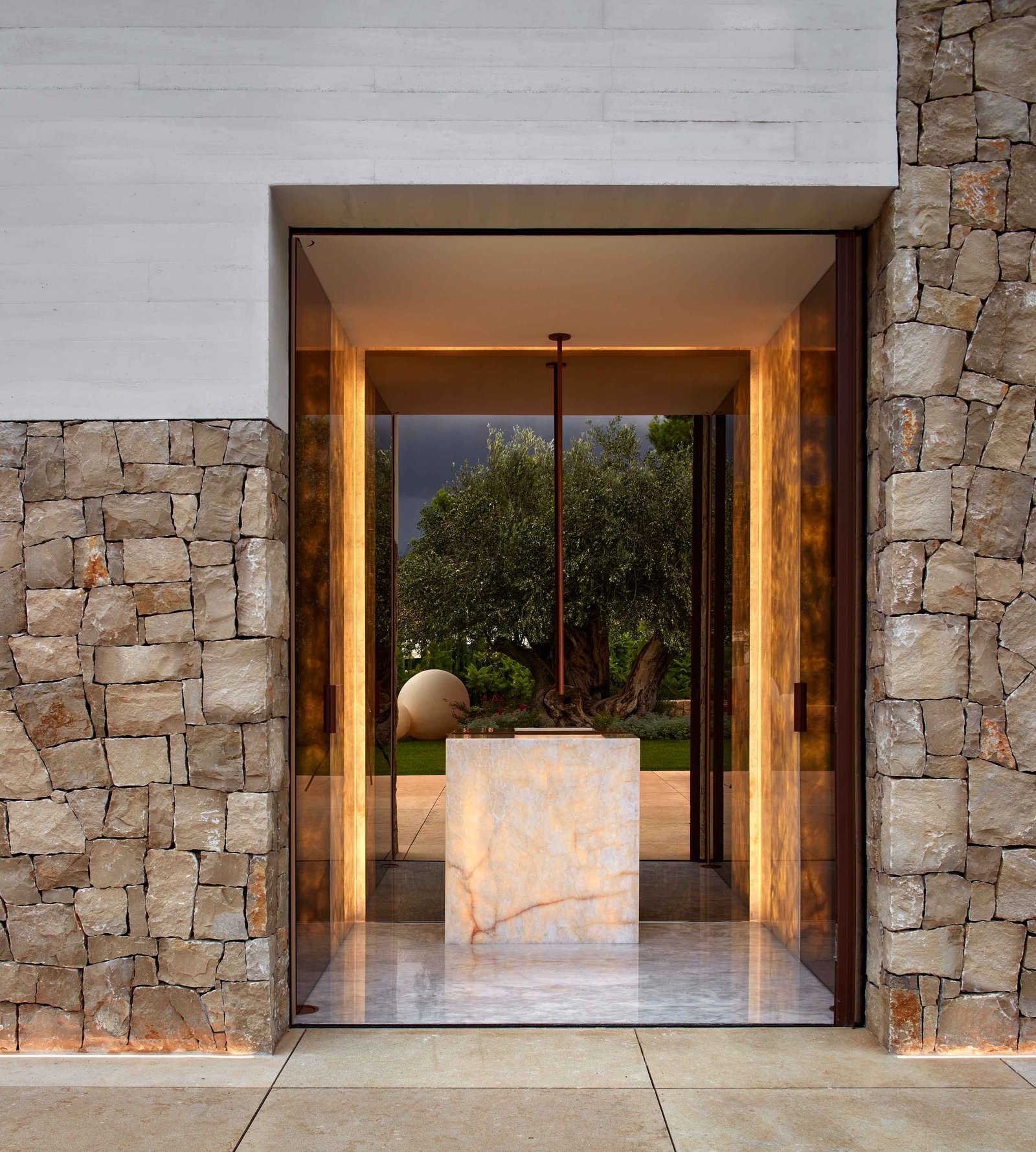 The stone plinth is topped by a white concrete trim, cast in such a way that the two materials form an expressive, complementary set that provides the house with a strong tectonic character.