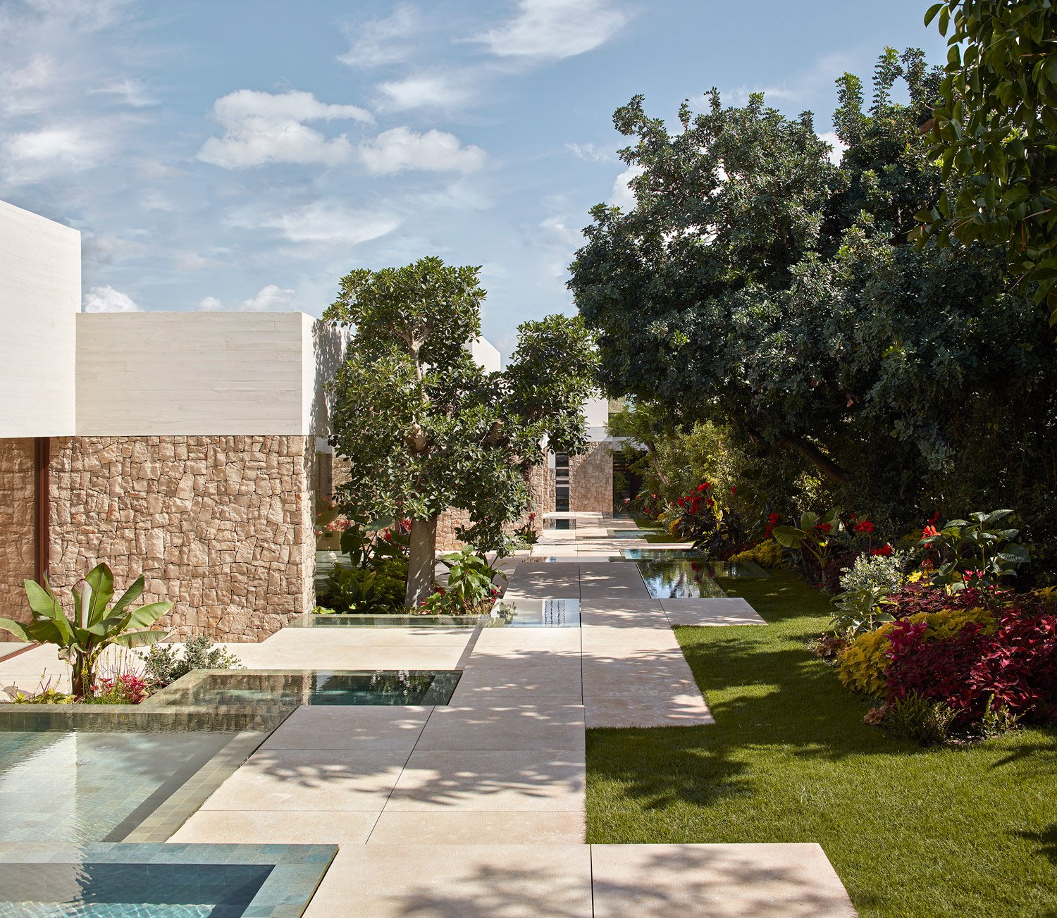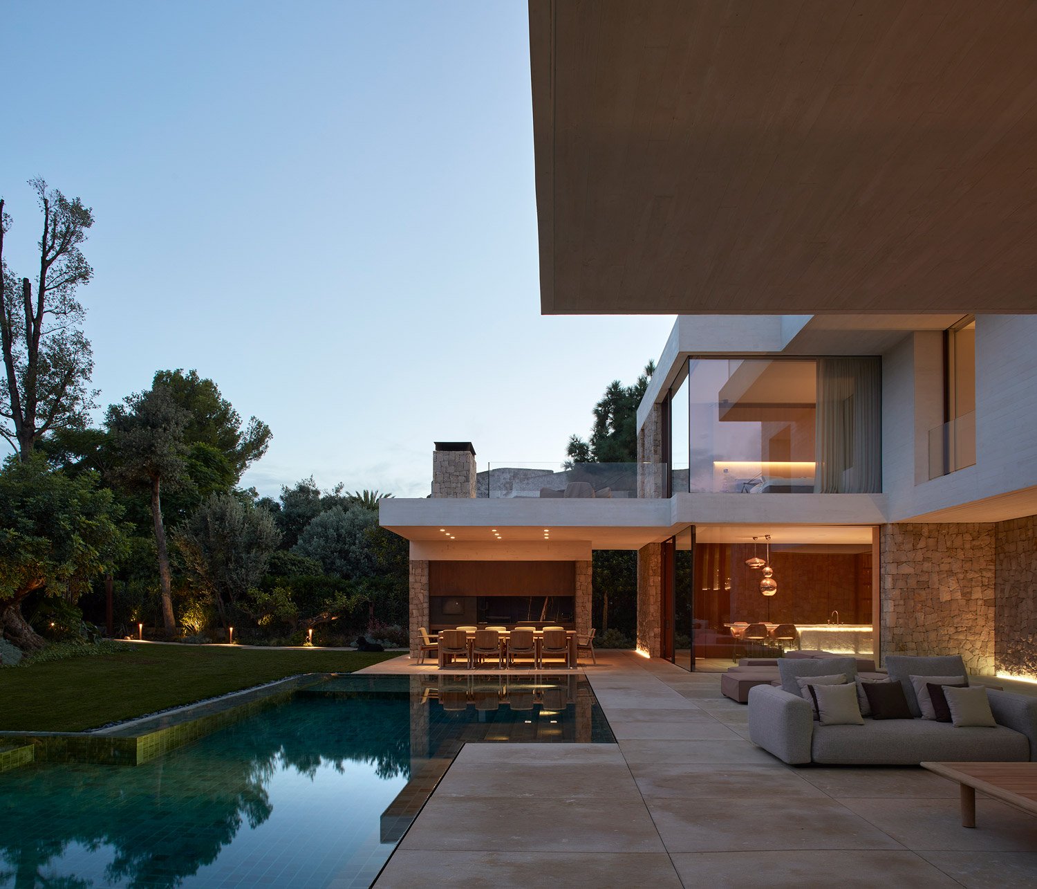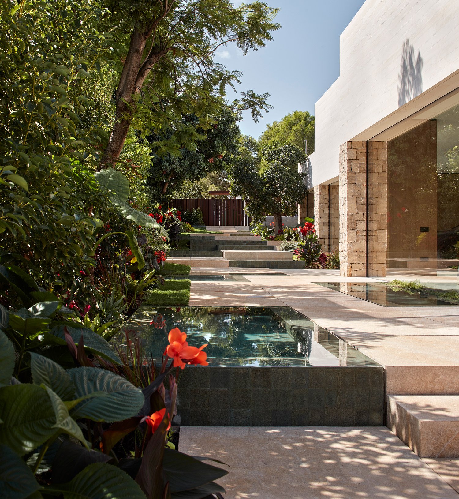 We access the house through the setback between two of the pieces. The ground floor opens to both sides of the plot, while the pool area is more open and passable. On the other hand, the views from the back garden are more controlled and