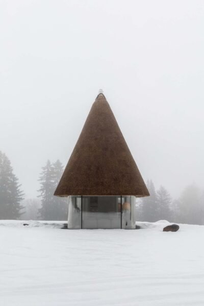Its sculptural form defines a strong, instantly recognisable silhouette, evoking both a traditional tall hat and an oversized mushroom rising from the landscape.