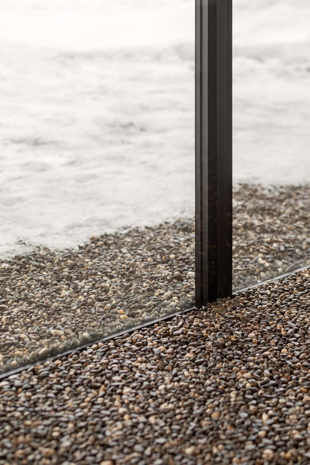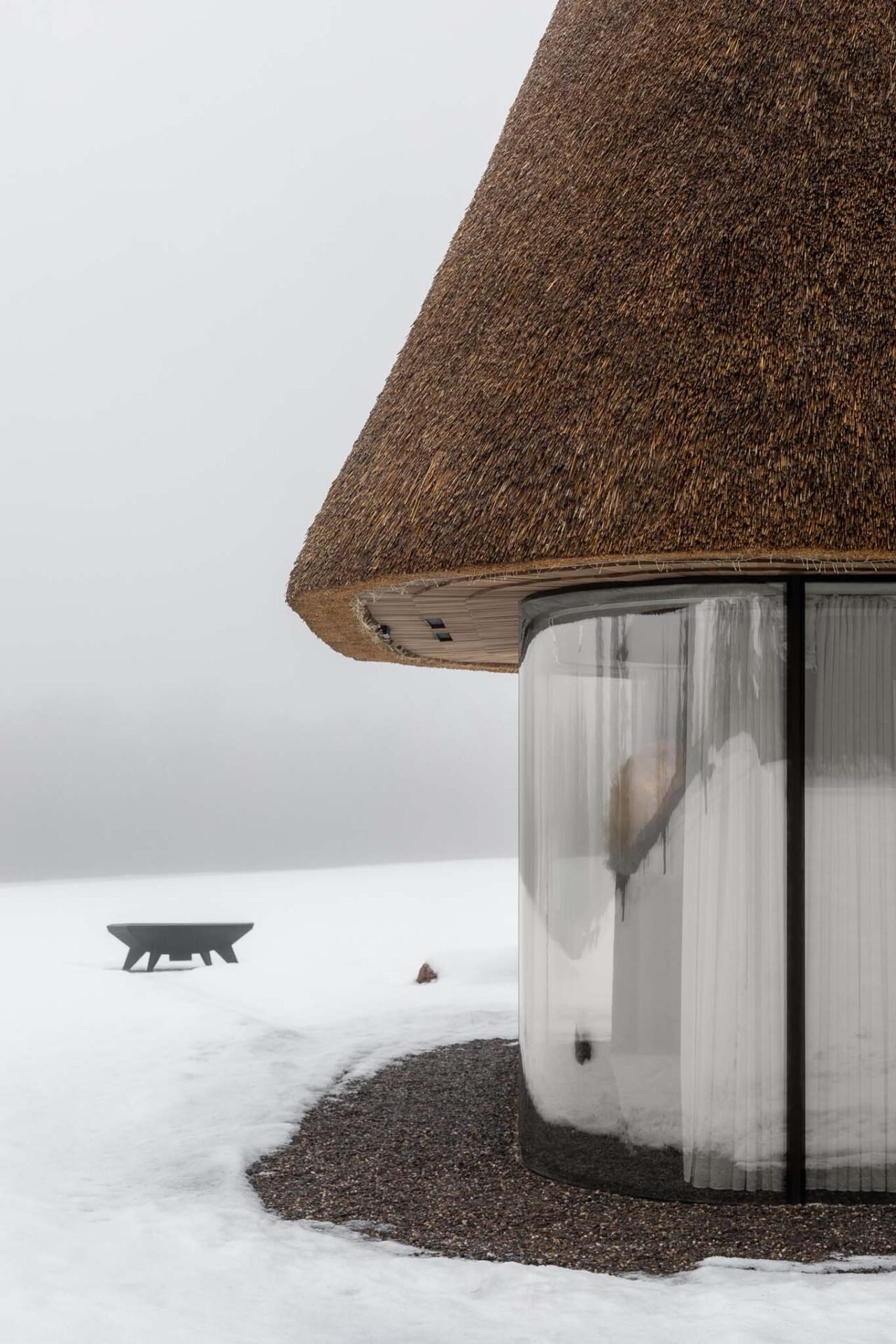 During the day, the fully glazed façades visually dissolve, creating the impression that the massive thatched roof is floating above the landscape. Inside and outside, the floor is finished with a continuous stone-carpet surface, pleasant to the touch and offering a subtle massage-like sensation when walking barefoot.
