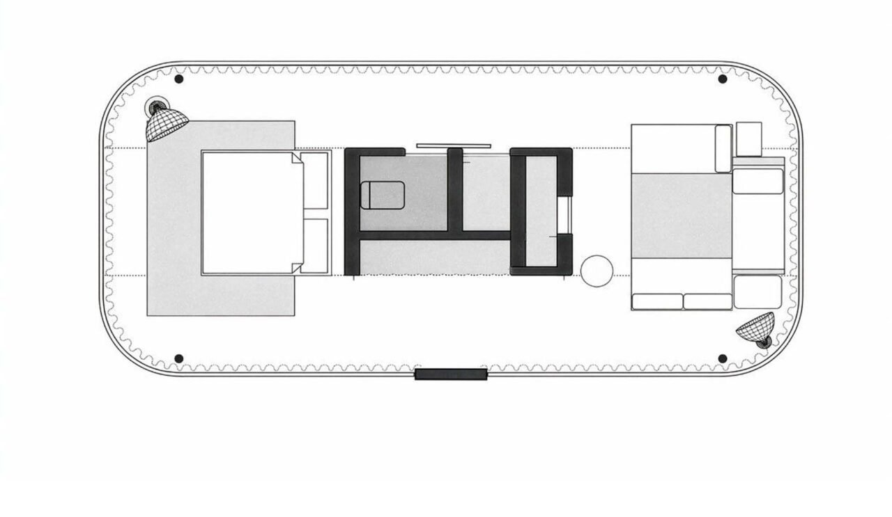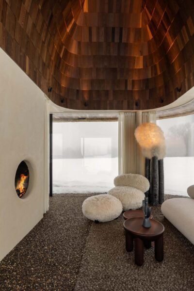 The uninterrupted glazing enhances the sense of immersion in nature, allowing the landscape to become an integral part of the emotional experience. When privacy is needed, guests can close dense yet visually light curtains, operated automatically via a control panel located by the bed.