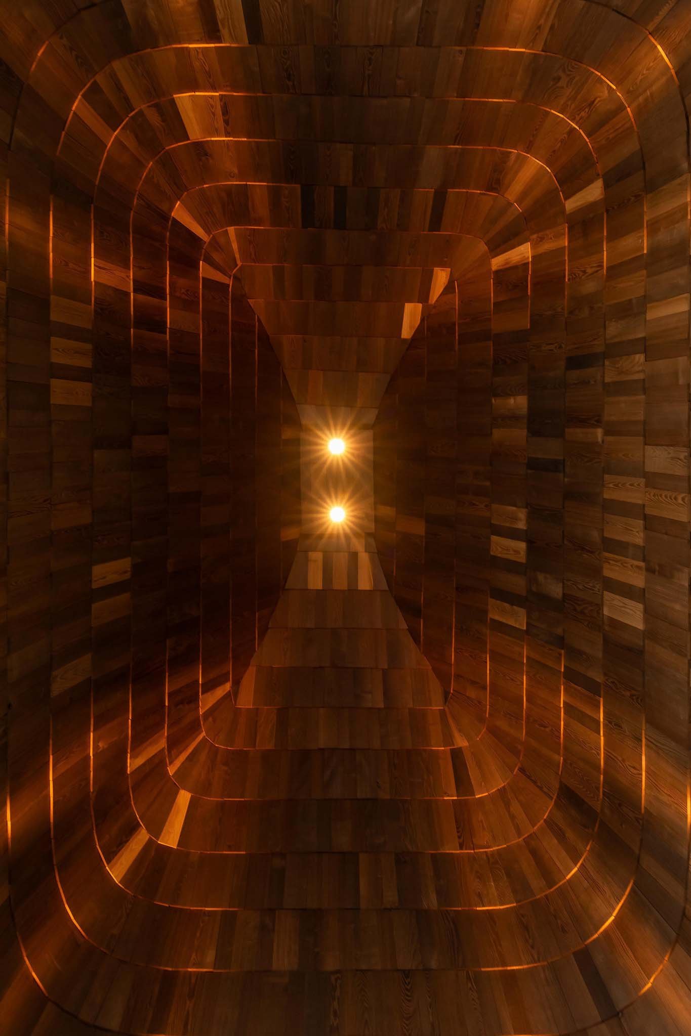 The inner surface of the roof dome is clad in wooden tiles that reference traditional wooden shingles historically used on Ukrainian rooftops. Rising to a height of 10 metres at its apex, the dome enhances the sense of openness and verticality, while allowing all engineering systems to remain fully concealed, leaving the walls visually clean and uninterrupted.