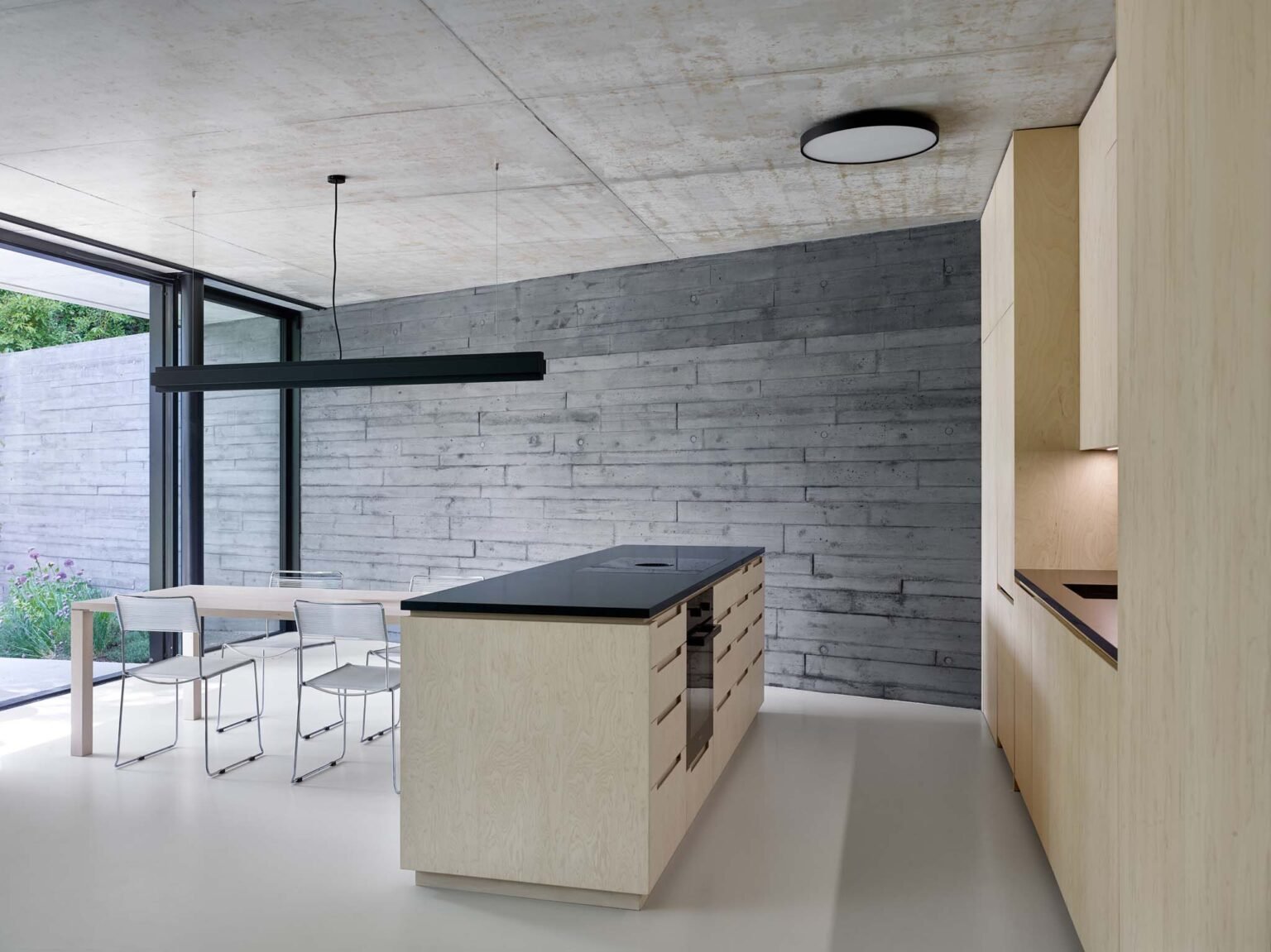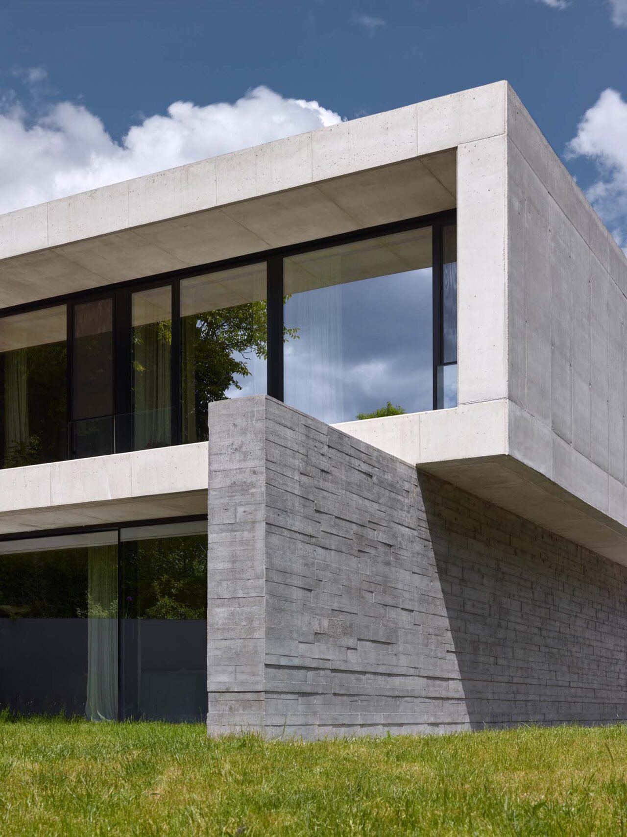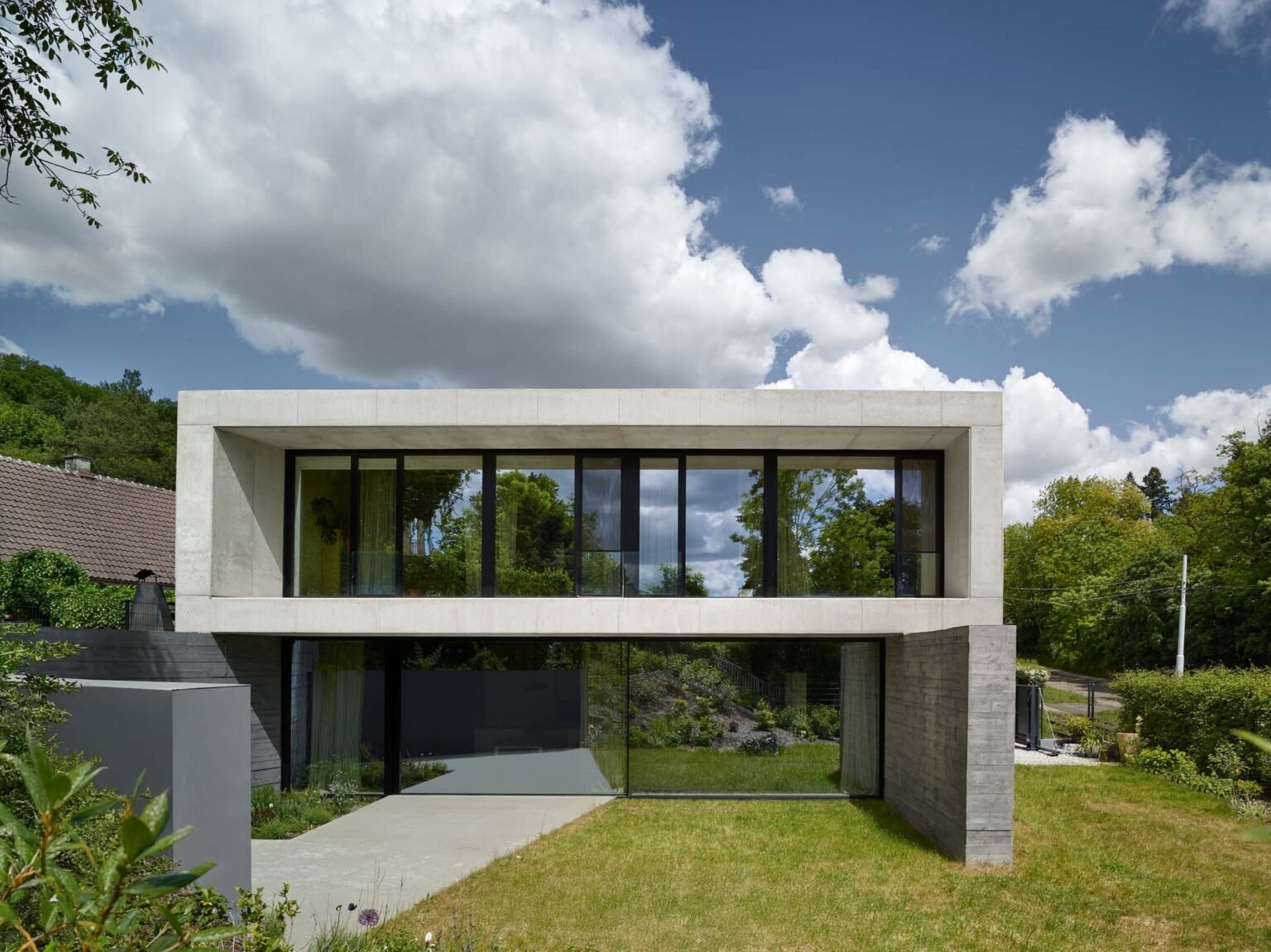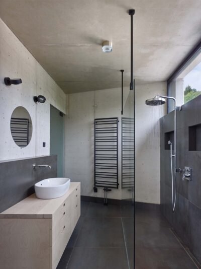 Thanks to concrete’s excellent thermal mass and the shaded glazed areas created by protruding structures, the house maintains a comfortable indoor climate throughout both summer and winter. The underfloor heating is powered by a heat pump.