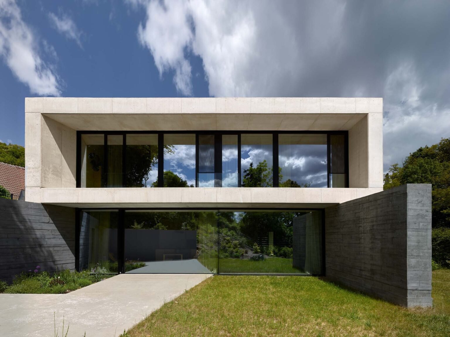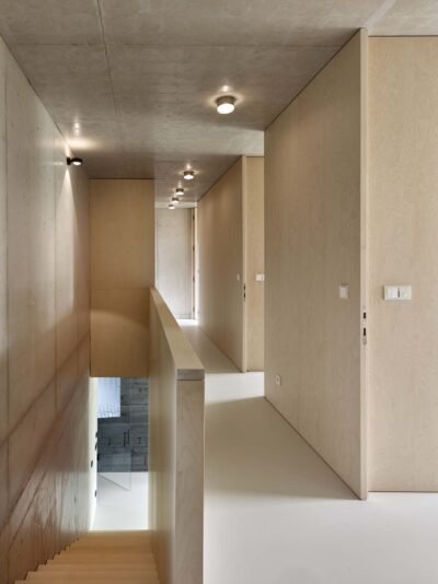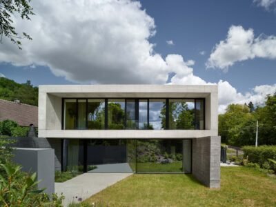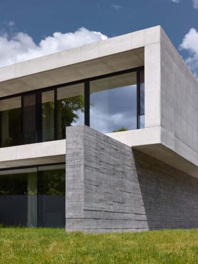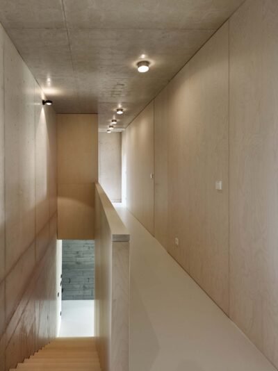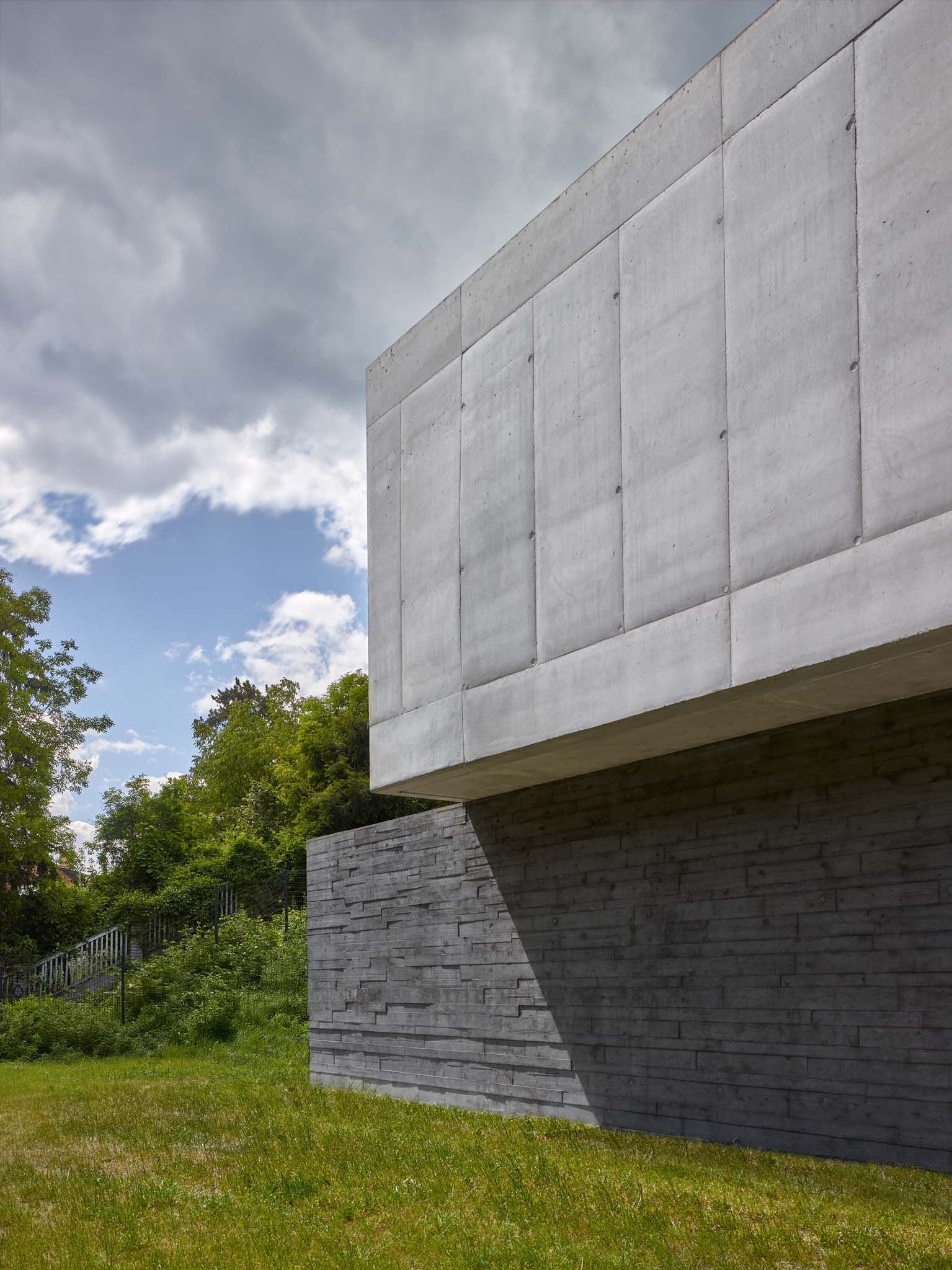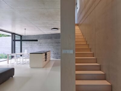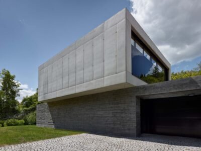 The intention to visually separate the ground floor from the upper level is underscored by two distinct tones and textures of concrete. The base, made with board-formed concrete and pigment, is dark and tactile, while the upper floor is light and smooth. The ground floor blends with the garden; its walls seamlessly transition into the hillside’s retaining structures, while the almost white upper volume merges with the sky.