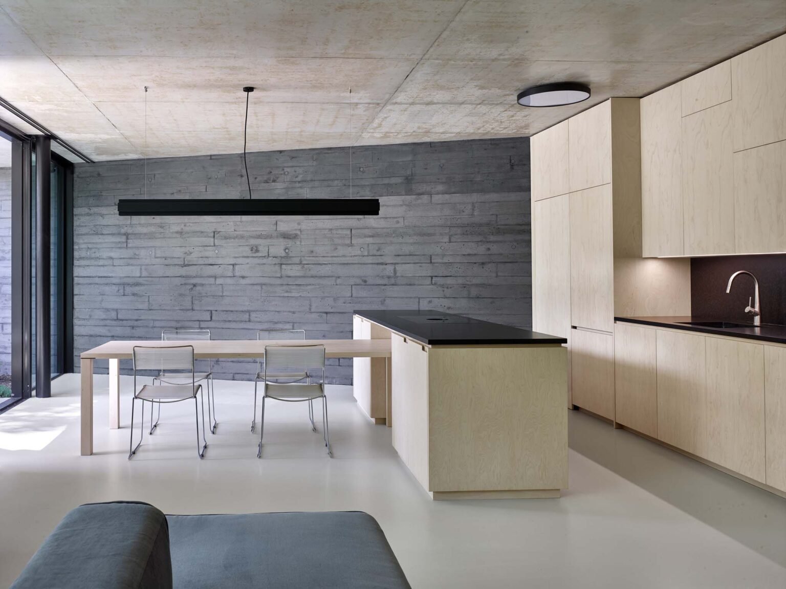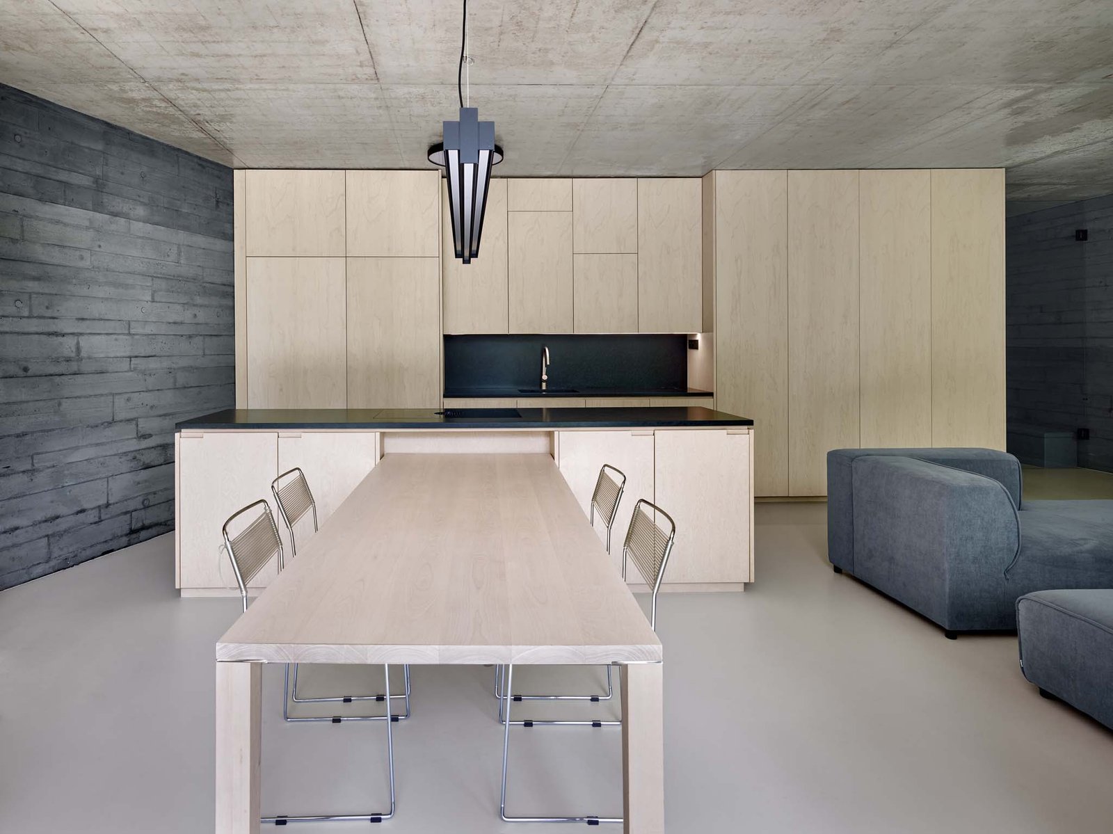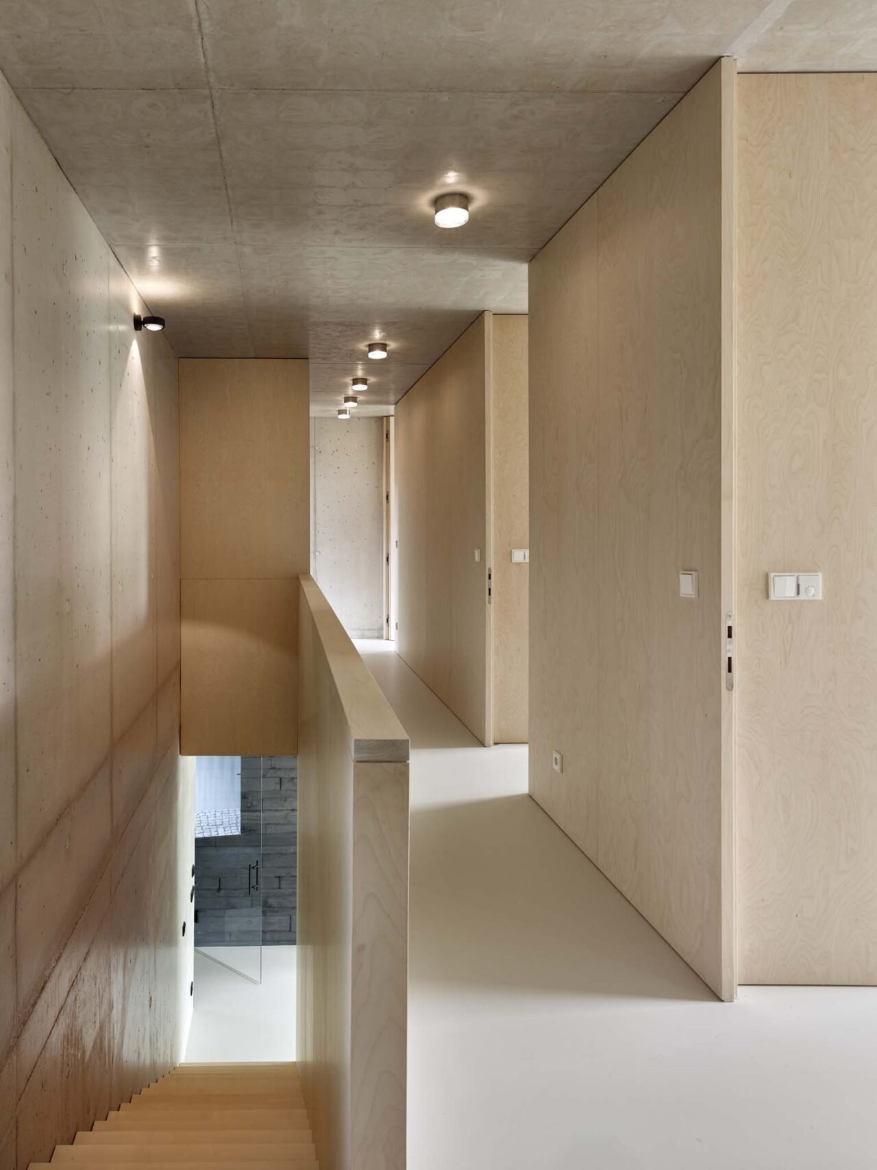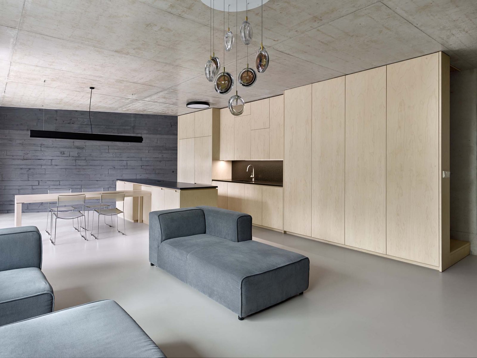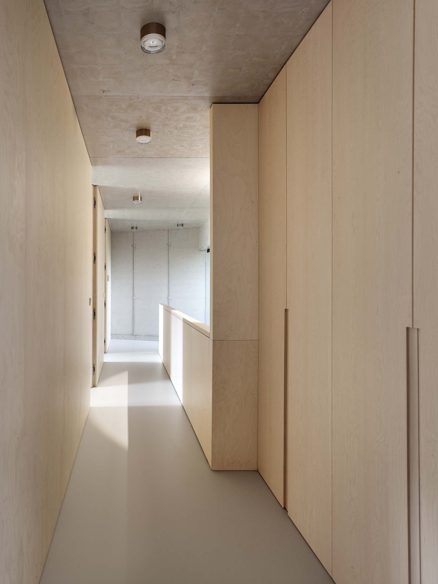 The interior is structured with custom-built-in furniture made of birch veneer, which separates individual rooms. The light-colored veneer harmonizes with the texture of the concrete — in both materials, every minor imperfection and natural pattern makes each square meter a unique original.