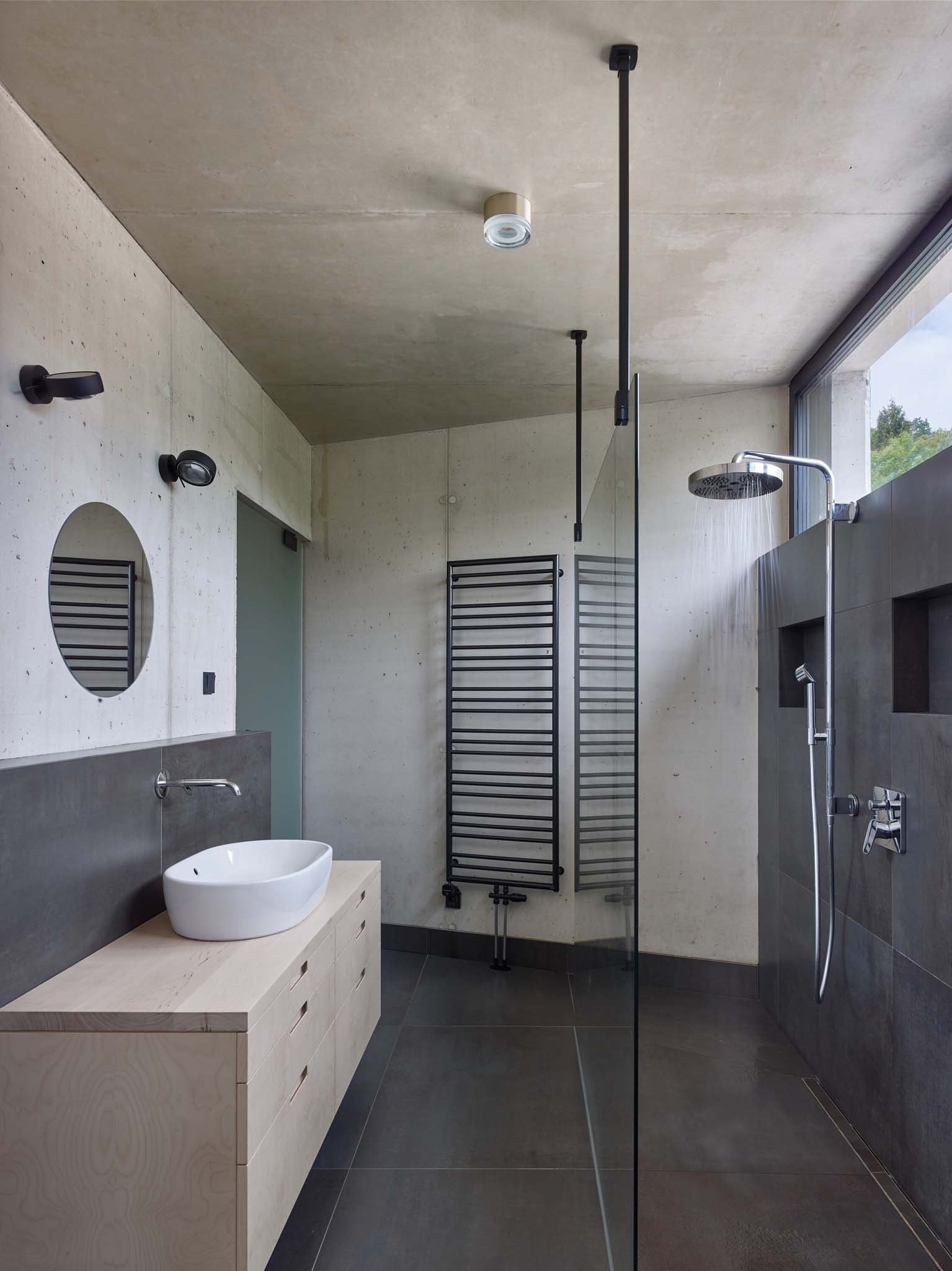 Reinforced concrete – main load-bearing structure made of double-sided exposed concrete with integrated thermal insulation, lacquered veneered MDF – custom-built furniture, cement screed – flooring.